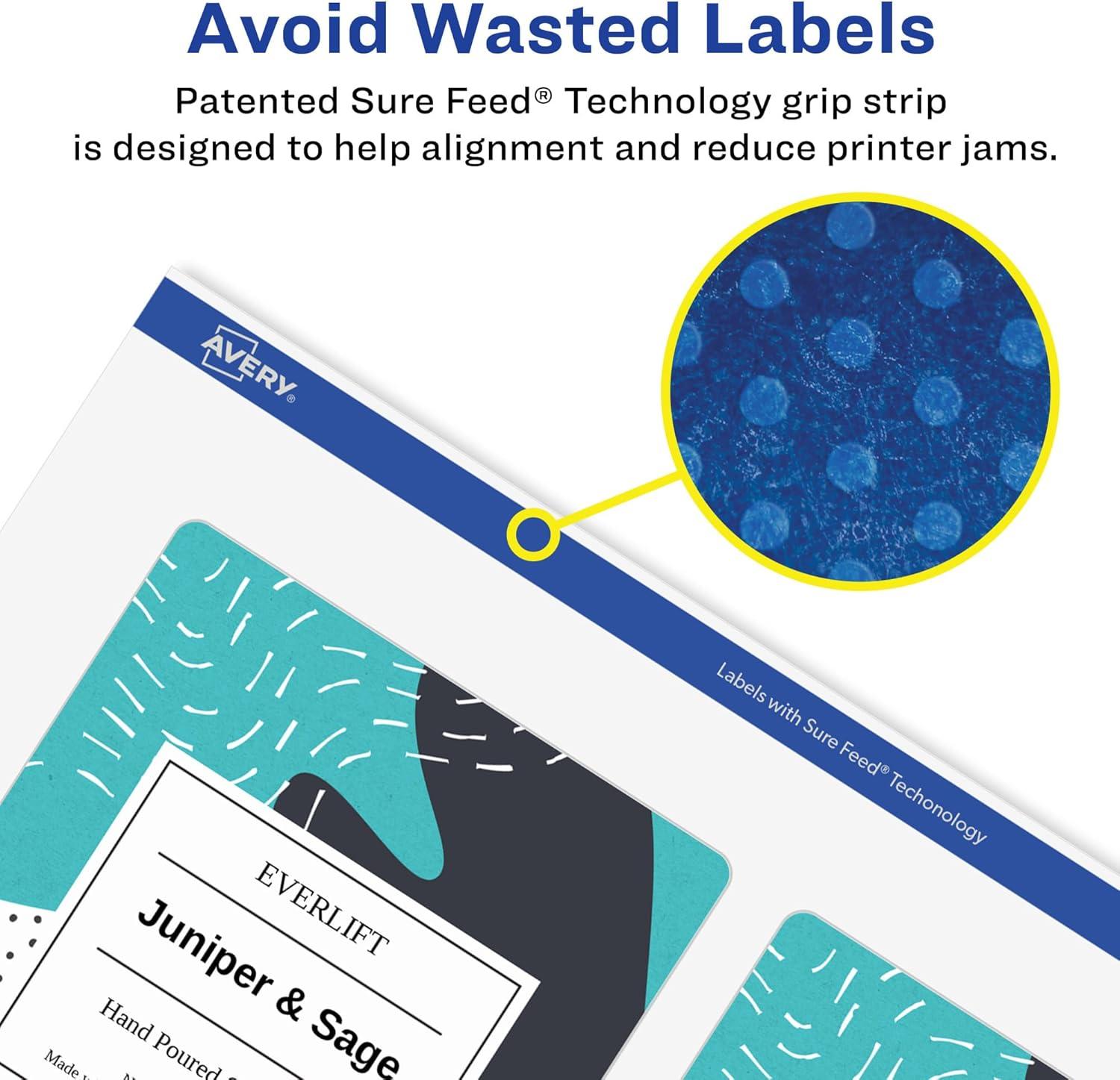 Avery labels with proprietary Sure Feed technology provide a more reliable feed through your printer, preventing misalignments and jams