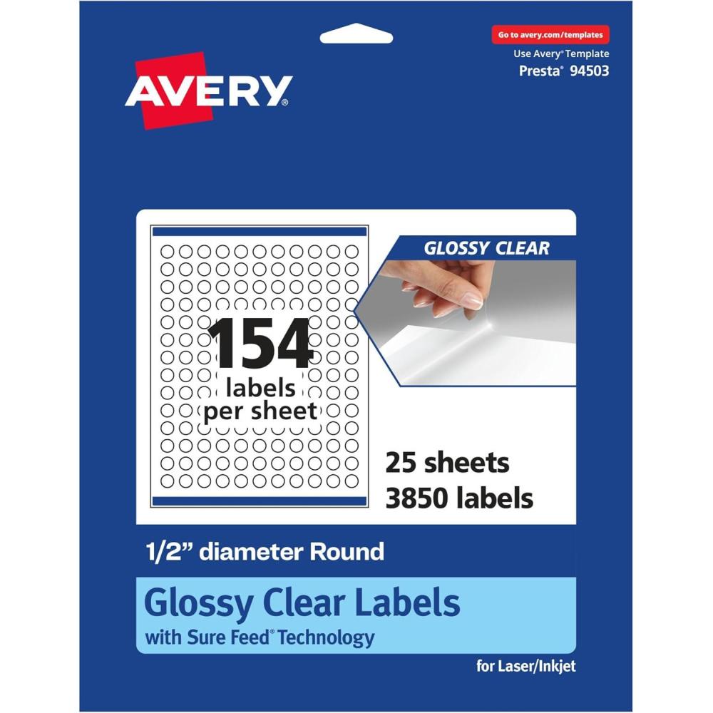 Avery Glossy Clear Round Labels, Sure Feed Technology, 0.5″ Diameter, 1,540 Glossy Clear Labels, Print-to-The-Edge, Laser/Inkjet Printable(3 850 labels)