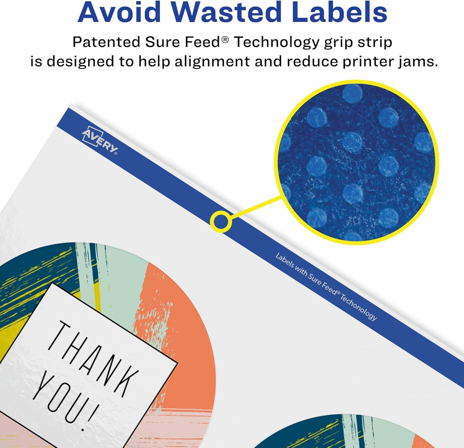 Avery labels with proprietary Sure Feed technology provide a more reliable feed through your printer, preventing misalignments and jams