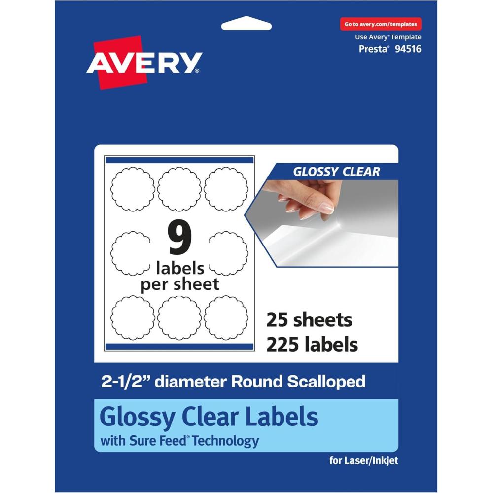 Avery Glossy Clear Round Scalloped Labels, Sure Feed Technology, 2.5" Diameter, 225 Glossy Clear Labels, Print-to-The-Edge, Laser/Inkjet Printable(225 labels)