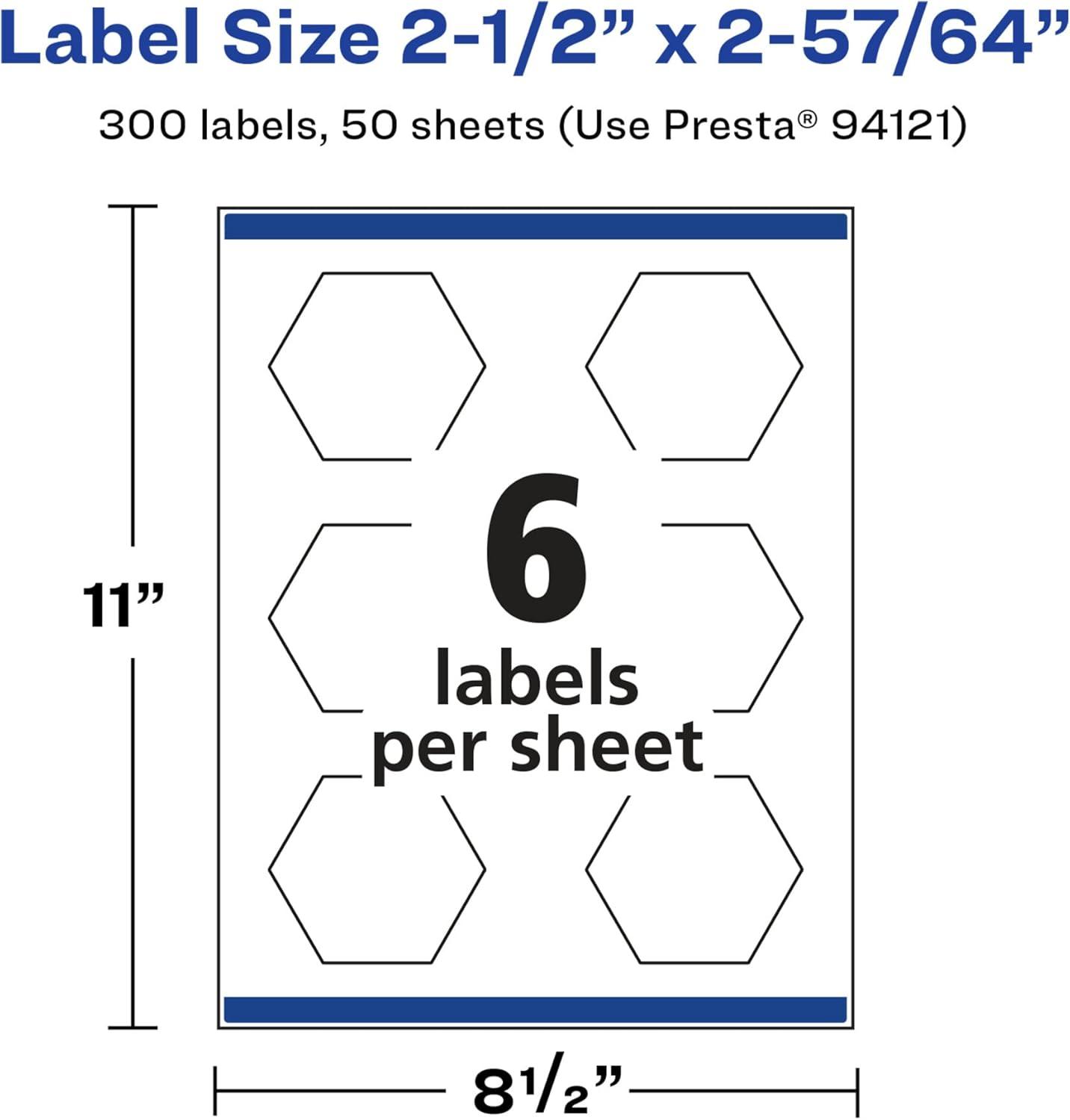 Avery Glossy White Hexagon Labels, Sure Feed Technology, 2-1/2″ x 2-57/64″, 60 Glossy White Labels, Print-to-The-Edge, Permanent Adhesive, Laser/Inkjet Printable(300 labels)