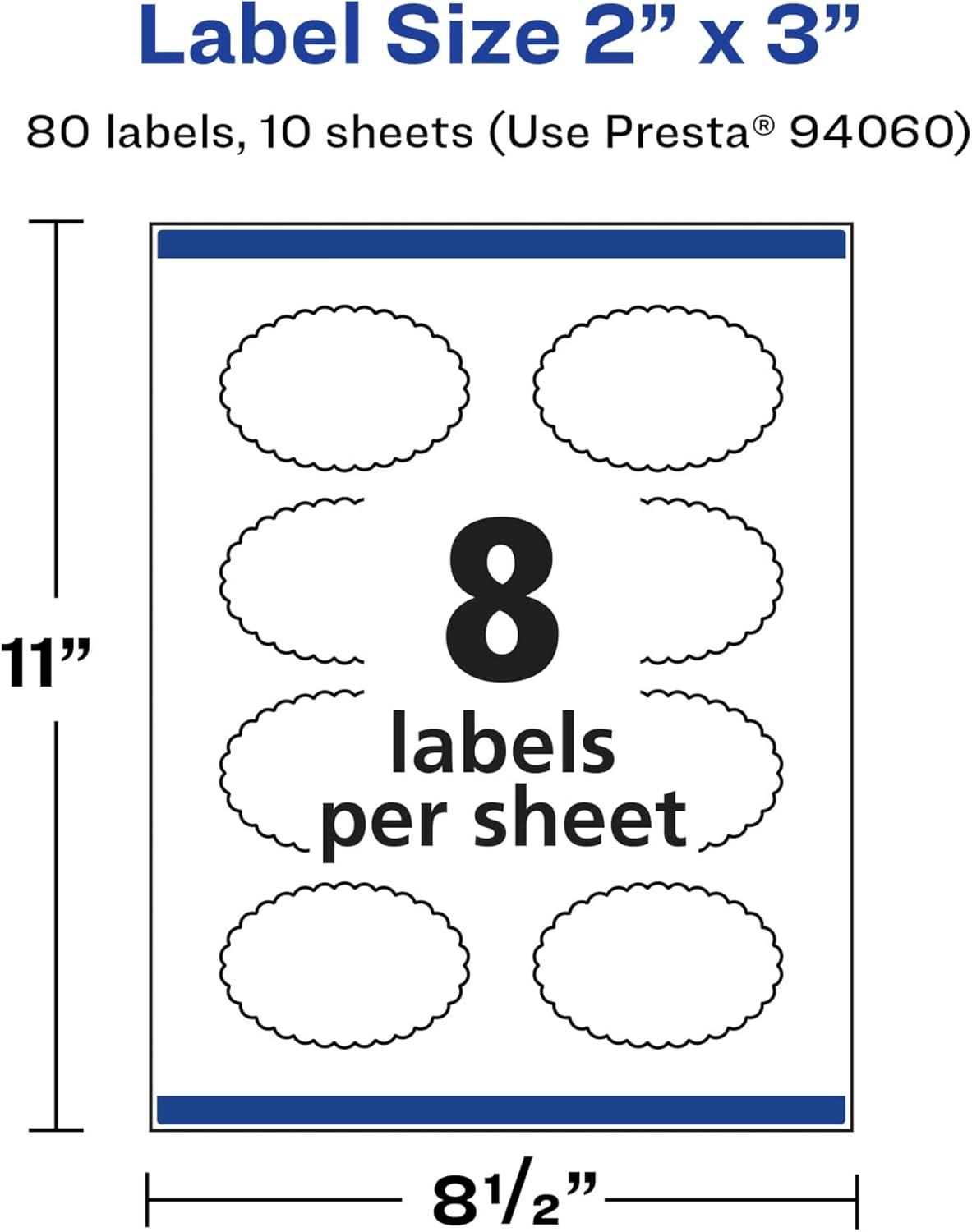 Add a beautiful shine to wedding labels, food labels, beverage labels, mason jar labels, canning labels, ingredient labels and more with Avery 2″ x 3″ Glossy White Oval Scalloped Labels. Avery oval scalloped labels are carefully constructed with patented features to provide the best results. Sure Feed technology prevents jams or smudges by creating a more reliable feed through your printer. The print-to-the-edge layout lets you print beautiful full-bleed designs that fill each blank sticker to the edge. These glossy white oval scalloped labels are compatible with both laser and inkjet printers so that you can effortlessly print bold, bright colors and clear, sharp text. The sturdy permanent label adhesive makes sure that your labels stick and stay to a variety of surfaces without peeling, curling or falling off. Easily customize labels with your own designs, art, symbols and messaging by using the free label templates and designs in Avery Design & Print. Whether you're creating product labels for a small business, custom labels for classrooms or professional labels for the office, Avery glossy white labels will add a brilliant and beautiful shine to any project.