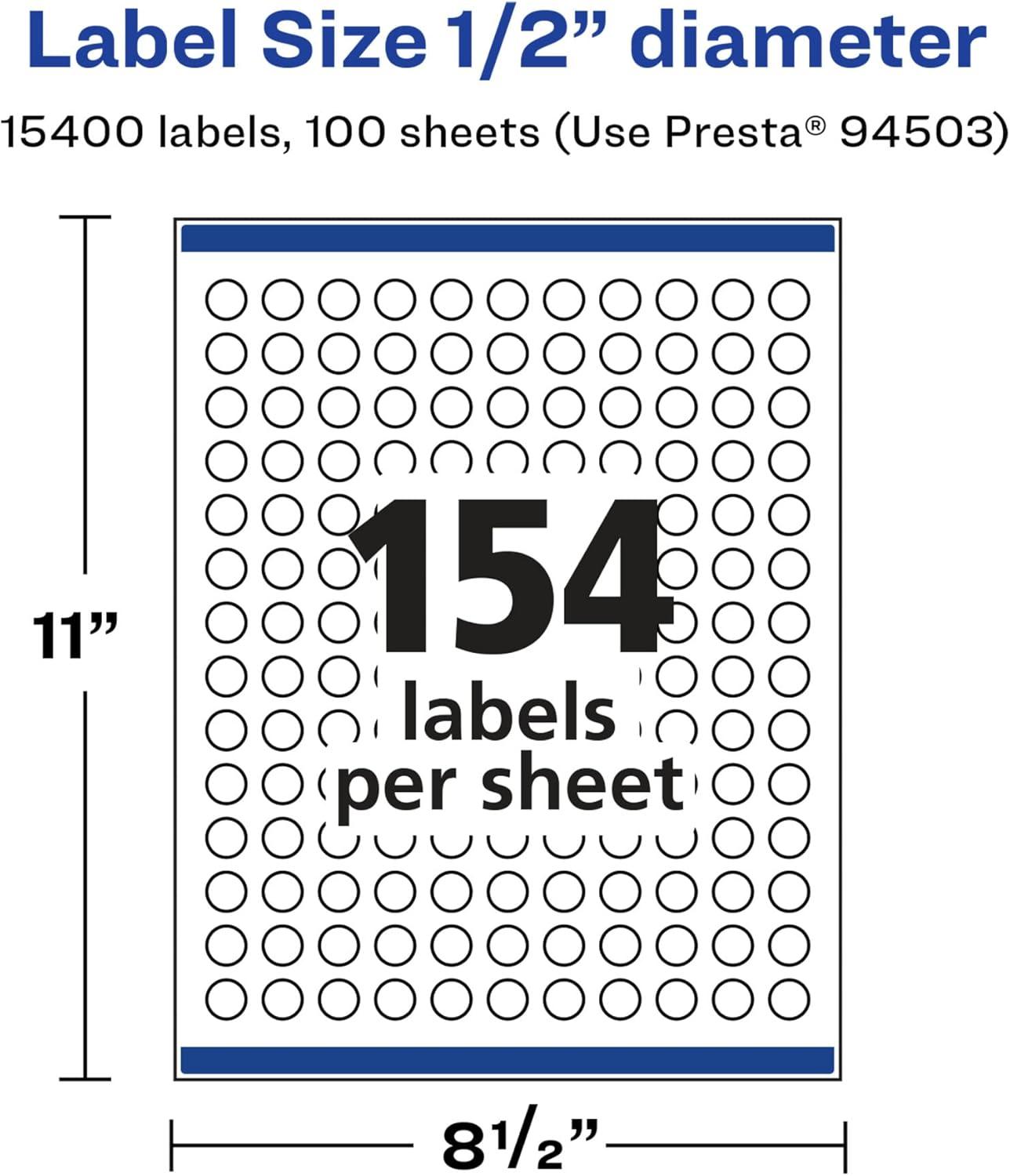 Avery Glossy White Round Labels, Sure Feed Technology, 1/2" Diameter, 1,540 Glossy White Labels, Print-to-The-Edge, Permanent Adhesive, Laser/Inkjet Printable(15 400 labels)