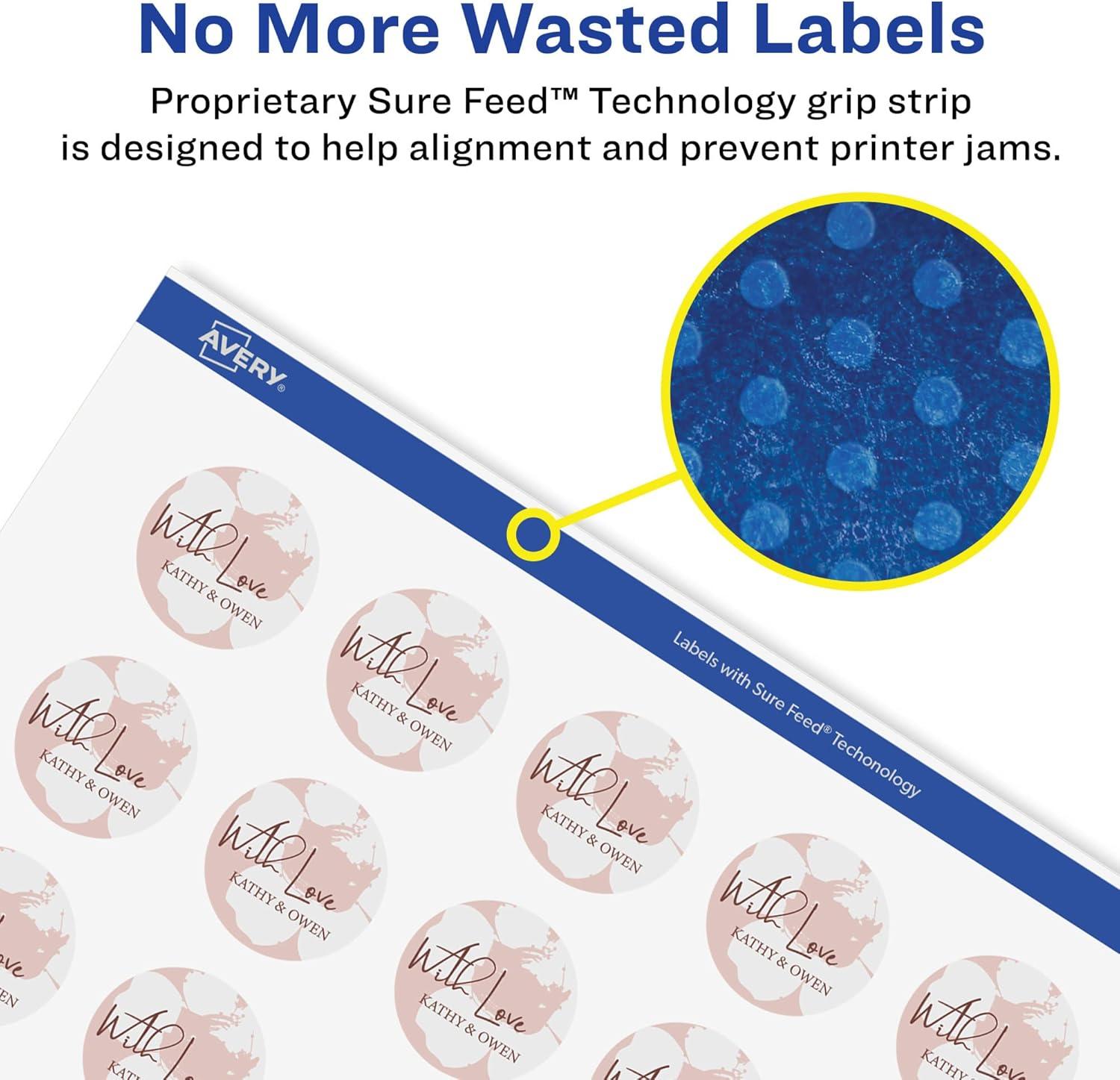 Avery labels with proprietary Sure Feed technology provide a more reliable feed through your printer, preventing misalignments and jams