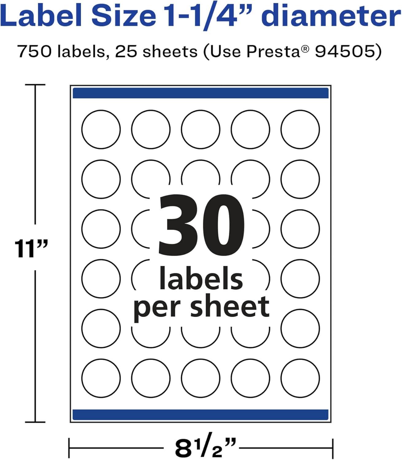 Avery Glossy White Round Labels, Sure Feed Technology, 1.25″ Diameter, 300 Glossy White Labels, Print-to-The-Edge, Permanent Adhesive, Laser/Inkjet Printable(750 labels)