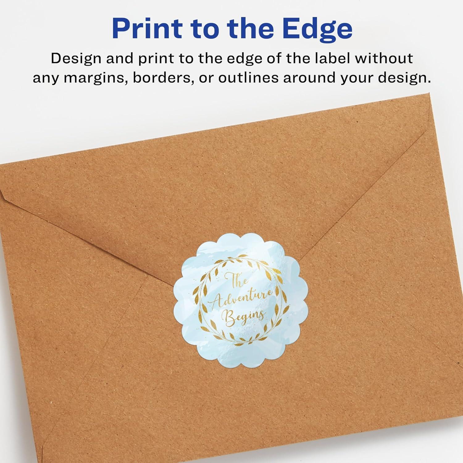 Add a beautiful shine to mailing seals, candle labels, pricing labels, soap labels, product labels, round spice labels, mason jar labels and more with Avery 2.5″ Diameter Glossy White Round Scalloped Labels. Avery round scalloped labels are carefully constructed with patented features to provide the best results. Sure Feed technology prevents jams or smudges by creating a more reliable feed through your printer. The print-to-the-edge layout lets you print beautiful full-bleed designs that fill each blank sticker to the edge. These glossy white round scalloped labels are compatible with both laser and inkjet printers so that you can effortlessly print bold, bright colors and clear, sharp text. The sturdy permanent label adhesive makes sure that your labels stick and stay to a variety of surfaces without peeling, curling or falling off. Easily customize labels with your own designs, art, symbols and messaging by using the free label templates and designs in Avery Design & Print. Whether you're creating product labels for a small business, custom labels for classrooms or professional labels for the office, Avery glossy white labels will add a brilliant and beautiful shine to any project.