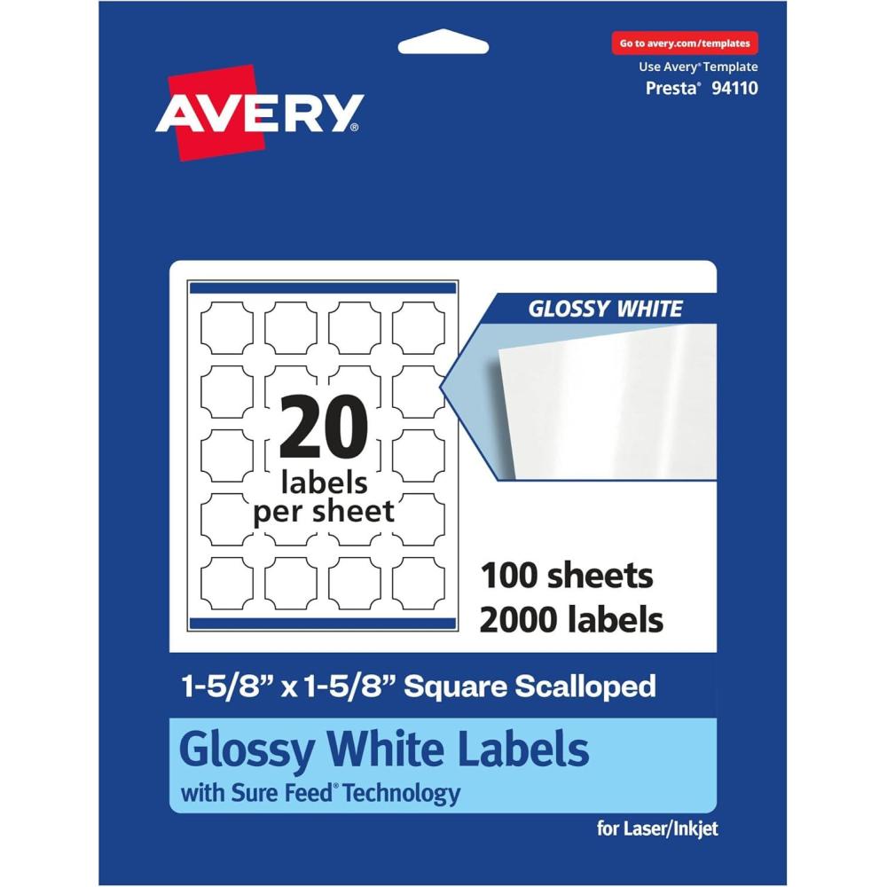 Avery Glossy White Square Scalloped Labels, Sure Feed Technology, 1-5/8″ x 1-5/8″, 200 Glossy White Labels, Print-to-The-Edge, Permanent Adhesive, Laser/Inkjet Printable(1 000 labels)