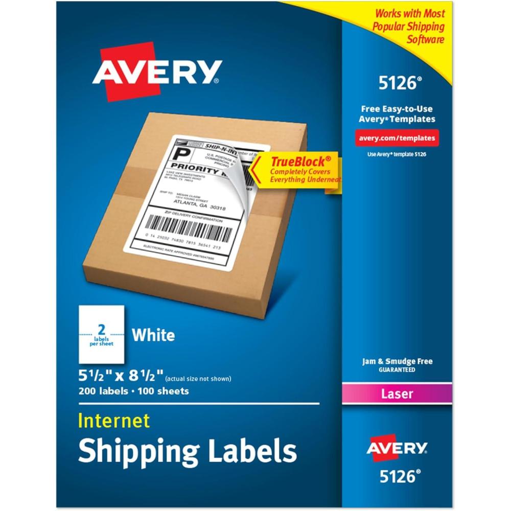 Simplify your mailing, shipping, and organizing tasks with this 1,000-pack of Avery 5126 Printable Internet Shipping Labels. Measuring 5.5″ x 8.5″, these versatile white labels are perfect for packages, product labeling, event signage, inventory labels, and more. Plus, TrueBlock technology completely blocks out everything underneath the label, so you can cover markings, correct errors, safeguard sensitive information, or give new life to old boxes by concealing old labels. The half-sheet labels are also backed with a strong permanent adhesive guaranteed to stick securely to a variety of surfaces, including cardboard, plastic, glass, tin, and metal. Optimized for laser printers, the label paper sheets deliver crisp graphics and clear text, helping prevent smudges and smears for a polished, professional look. Personalize your labels by hand or easily design and print your own stickers and labels using Avery Design & Print Online. Our easy-to-use design software allows you to import your own artwork, logos, and designs, or you can use the available templates and tools to create custom labels you can print yourself. Ideal for organizing your space, branding products, or preparing packages for shipping, this item comes with five packs of Avery 5126 for a total of 1,000 customizable labels.