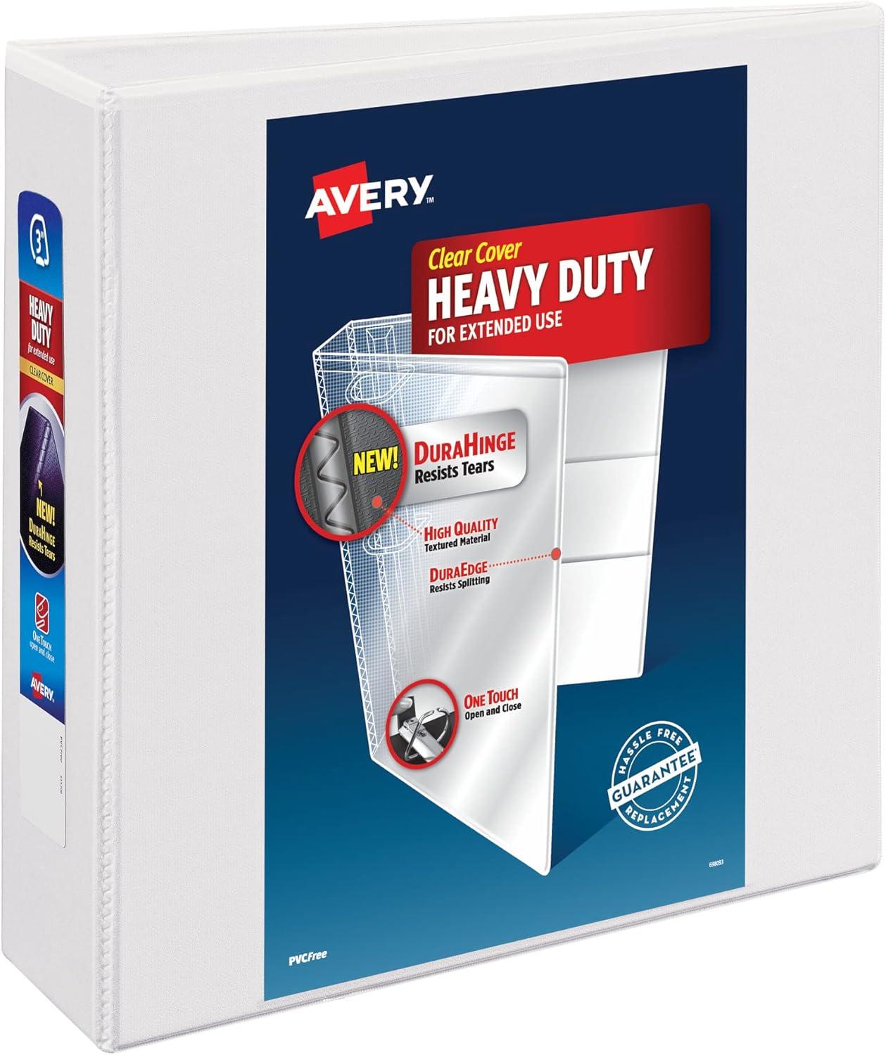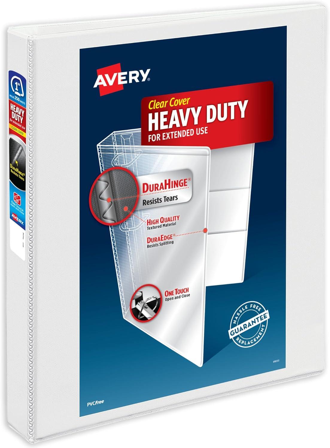 If you're looking for a binder that is stronger, lasts longer, and can hang tough with even the most demanding activities, look no further than the Avery Heavy Duty 0.5-inch binder in white. Its sturdy exterior features a tear-resistant spine (DuraHinge) and more flexible, split-resistant edges (DuraEdge). Heavy Duty binders are also fully adhered with a deep-weave polypropylene cover that is resistant to bubbling, surface wrinkles, and is tear-resistant. The interior of this binder is just as impressive as its exterior. With back-mounted slant rings, your pages will never curl again. Pages lay flat and are easy to turn, while the cover opens and closes without pulling on your papers. The One Touch slant rings keep pages secure and open with ease at the touch of a button. Enjoy extra organization and storage capabilities with four interior clear pockets made of nonstick material that won't lift or transfer ink from your documents. Heavy Duty binders are ideal for activities that require heavy referencing. Great for students of all ages and can withstand the rigorous daily demands of a school binder. Heavy Duty binders can also be used as a recipe binder, music binder, photo album, scrapbook and more. For those who collect trading cards like Pokémon or Yu-Gi-Oh, pair this binder with Avery's Trading Card Storage Sheets for effortless organization. Each binder holds up to 135 sheets of paper with 0.5 inch capacity slant rings. Rings are standard 3-hole spaced and accommodate 8.5″ x 11″ pages nicely. A wider front and back binder panel also ensure that standard dividers and sheet protectors are fully covered—a must for students. All Heavy Duty binders are made with PVC-free material. Personalize your view binder using the free templates, fonts, and designs at avery.com/templates.