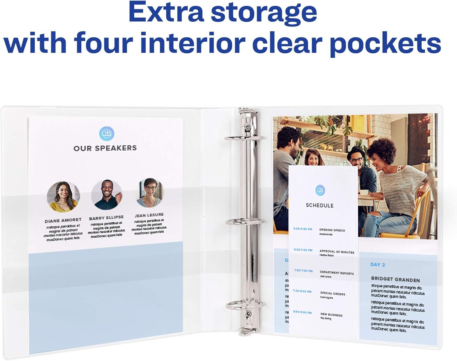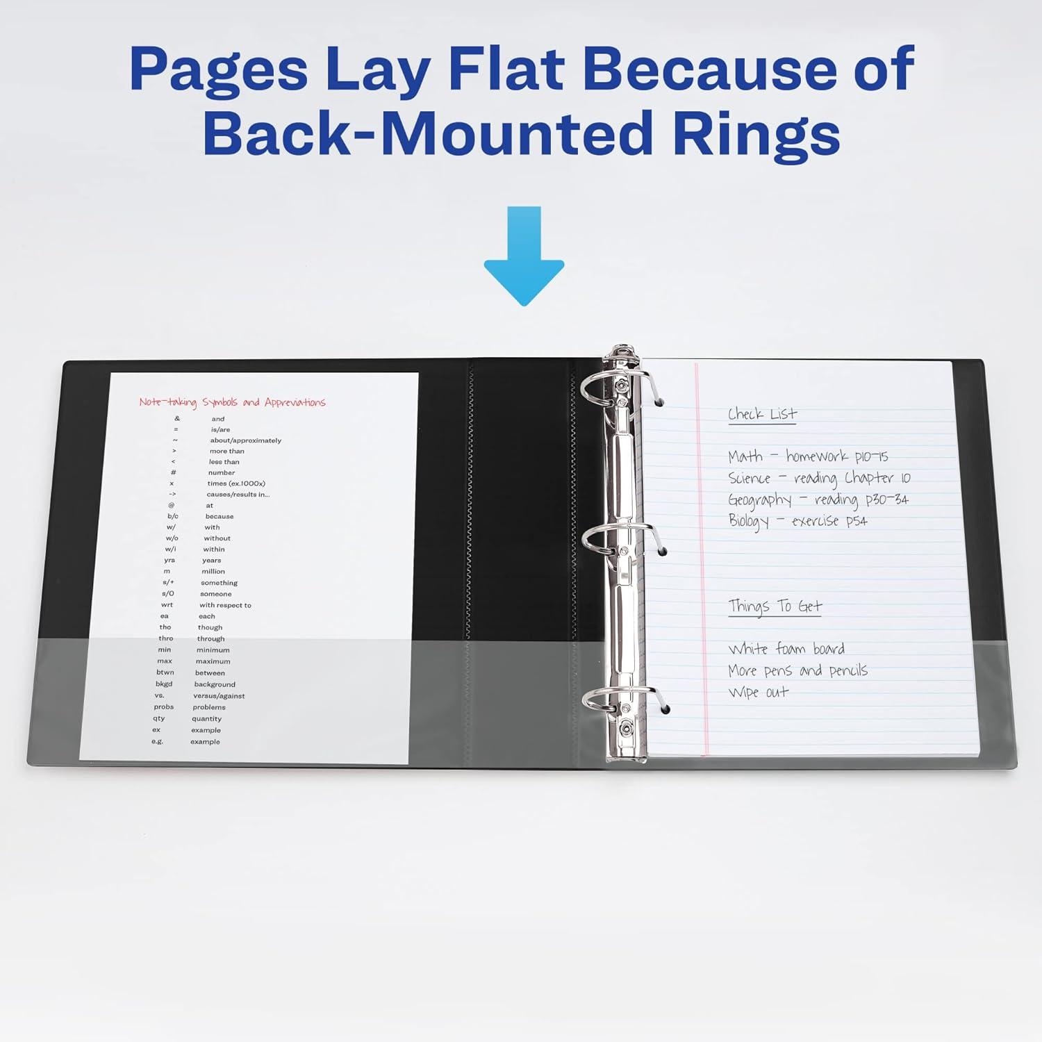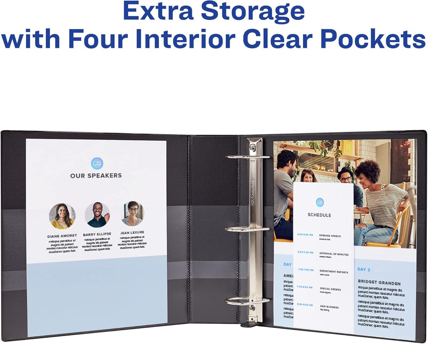 If you're looking for a binder that is stronger, lasts longer, and can hang tough with even the most demanding activities, look no further than the Avery Heavy Duty 0.5-inch binder in white. Its sturdy exterior features a tear-resistant spine (DuraHinge) and more flexible, split-resistant edges (DuraEdge). Heavy Duty binders are also fully adhered with a deep-weave polypropylene cover that is resistant to bubbling, surface wrinkles, and is tear-resistant. The interior of this binder is just as impressive as its exterior. With back-mounted slant rings, your pages will never curl again. Pages lay flat and are easy to turn, while the cover opens and closes without pulling on your papers. The One Touch slant rings keep pages secure and open with ease at the touch of a button. Enjoy extra organization and storage capabilities with four interior clear pockets made of nonstick material that won't lift or transfer ink from your documents. Heavy Duty binders are ideal for activities that require heavy referencing. Great for students of all ages and can withstand the rigorous daily demands of a school binder. Heavy Duty binders can also be used as a recipe binder, music binder, photo album, scrapbook and more. For those who collect trading cards like Pokémon or Yu-Gi-Oh, pair this binder with Avery's Trading Card Storage Sheets for effortless organization. Each binder holds up to 135 sheets of paper with 0.5 inch capacity slant rings. Rings are standard 3-hole spaced and accommodate 8.5″ x 11″ pages nicely. A wider front and back binder panel also ensure that standard dividers and sheet protectors are fully covered—a must for students. All Heavy Duty binders are made with PVC-free material. Personalize your view binder using the free templates, fonts, and designs at avery.com/templates.