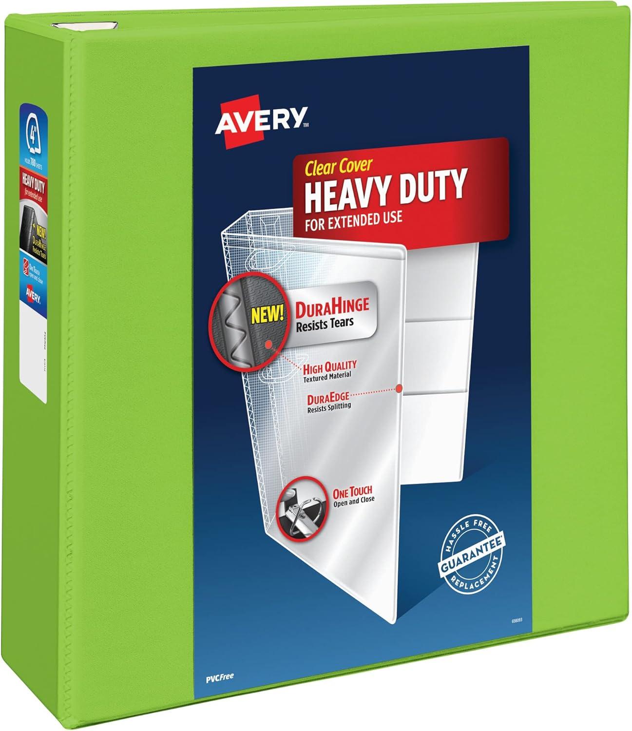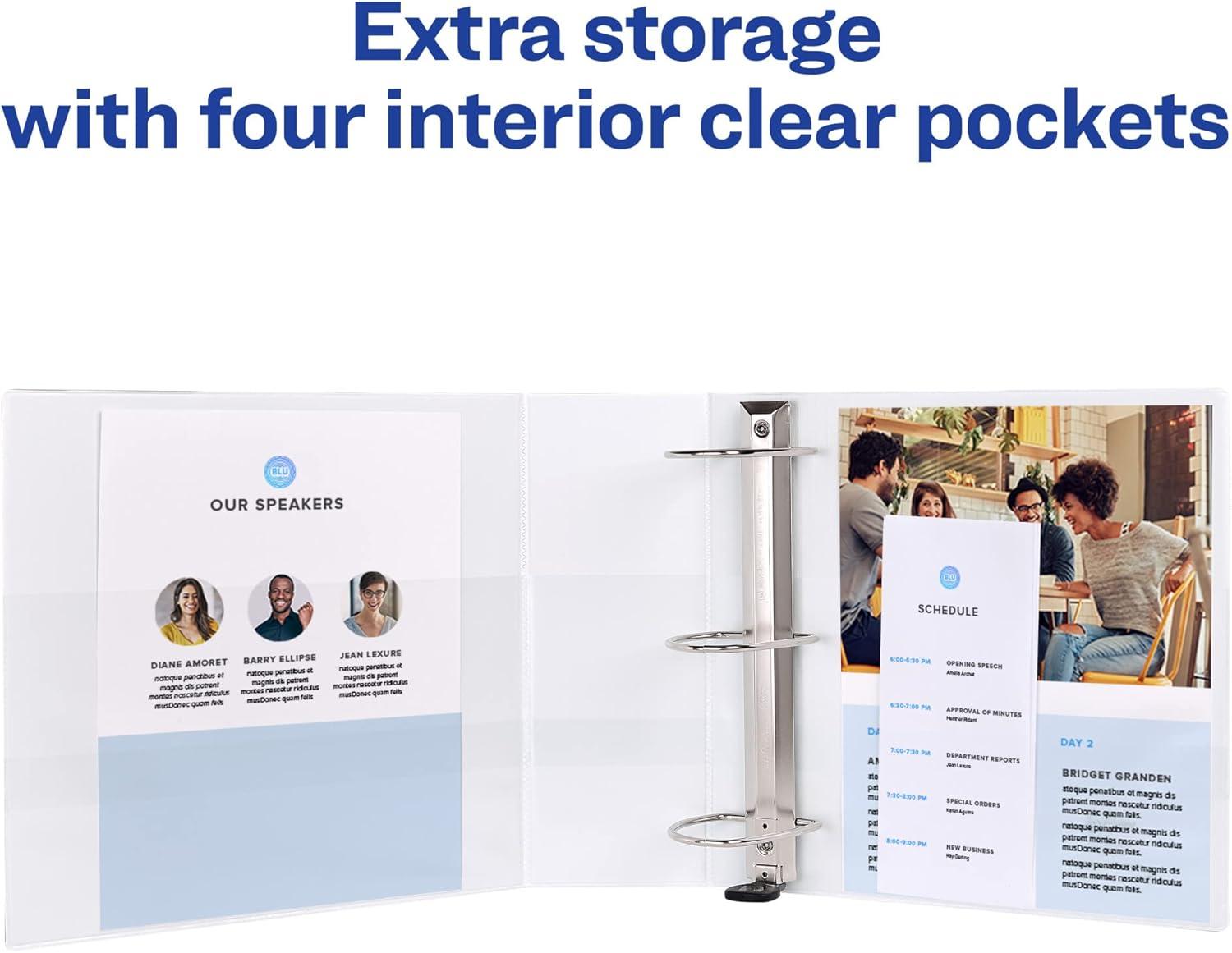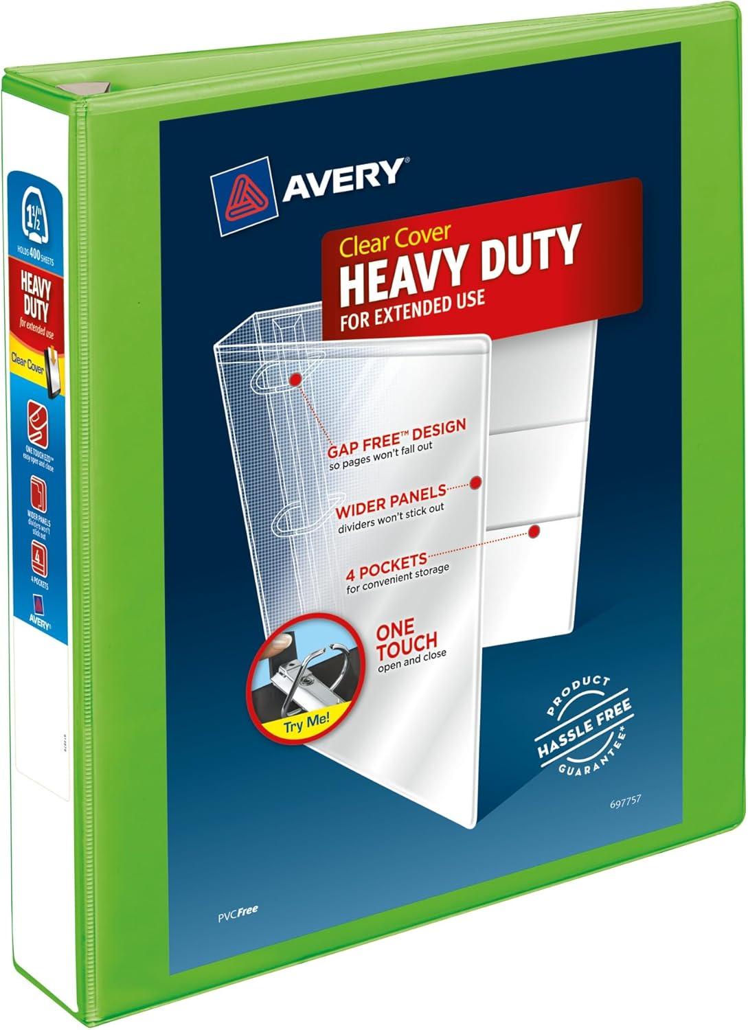 Heavy-duty binder is built for extended use. Clear cover and spine allow easy customization. Four clear interior pockets offer extra storage. Wider front and back binder panels fully cover standard dividers and sheet protectors. One touch EZD locking rings open with ease and keep letter-size pages secure. Ezd rings have a higher page capacity compared to same-size slant and round rings. Gap free ring feature prevents gapping and misalignment of rings. Pages lie flat with back-mounted rings. Binder is made of heavy-duty Poly. Nonstick material won't lift ink or toner off printed pages.