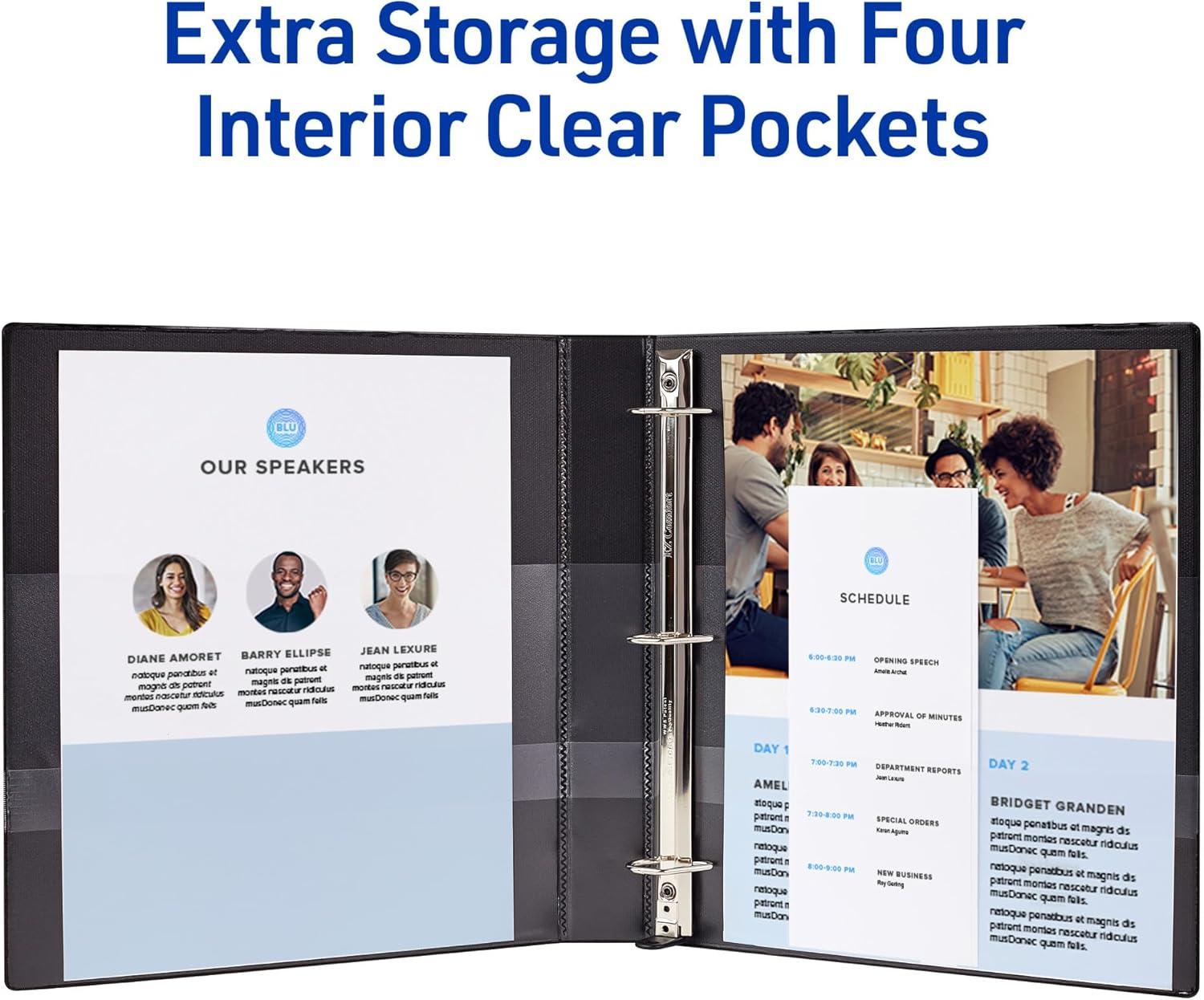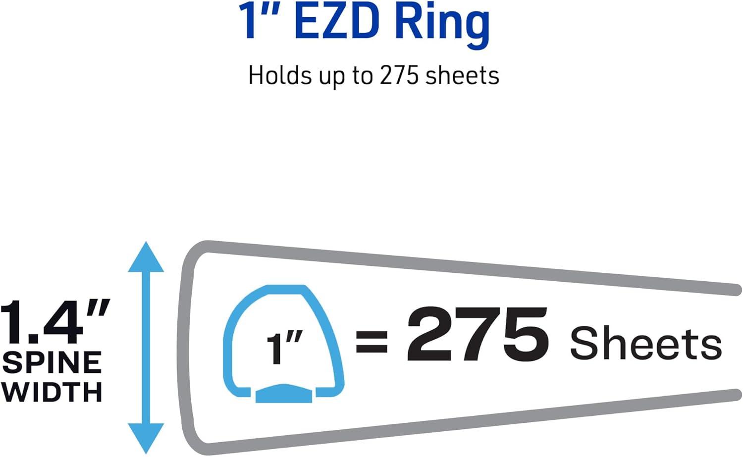 For a strong, long-lasting binder that can hang tough with even the most demanding activities, go with this Avery 79199 Heavy Duty 3 Ring Binder. This 1-inch white binder features a sturdy exterior with a tear-resistant spine (DuraHinge) and more flexible, split-resistant edges (DuraEdge). Plus, the deep-weave polypropylene cover makes it resistant to tears, bubbling, and surface wrinkles. Inside, back-mounted rings ensure pages lay flat and turn easily, while the one-touch design makes opening and closing the rings a breeze. Each 3 ringed binder features a 1.4-inch spine and 1-inch EZD rings that hold up to 275 sheets of 8.5″ x 11″ paper, dividers, or sheet protectors. That’s a 40-50% boost over basic ring binders! A wider front and back binder panel also ensures that standard dividers and sheet protectors are fully covered. Perfect for use as a report binder, recipe binder, school binder, presentation binder, photo album, and more. For those who collect trading cards, pair this card binder with Avery's Trading Card Storage Sheets for effortless organization. No matter what you use it for, you can easily personalize your own custom binder using Avery Design & Print Online and the available cover binder templates, fonts, and designs.