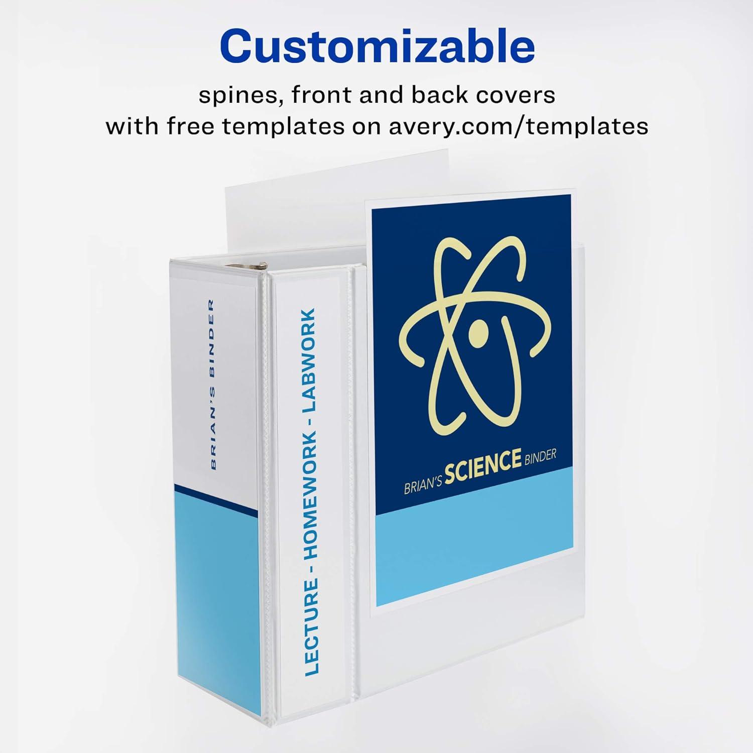 Each binder holds up to 670 sheets of paper with 3 inch capacity EZD rings; a 40-50% boost over basic ring binders. Rings are standard 3-hole spaced and accommodate 8.5″ x 11″ pages nicely. A wider front and back binder panel also ensure that standard dividers and sheet protectors are fully covered; a must for students. All Heavy Duty binders are made with PVC-free material. Personalize your view binder using the free templates, fonts, and designs on the Avery site.