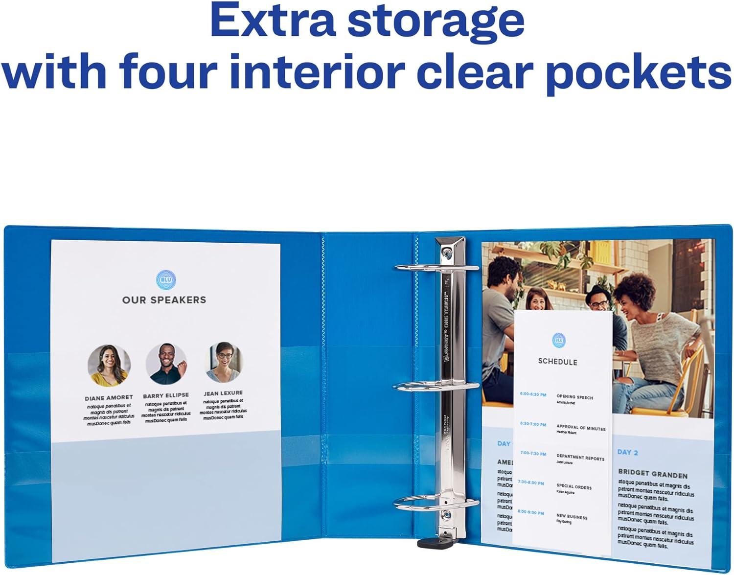 The interior of this binder is just as impressive as its exterior. With back-mounted EZD rings, your pages will never curl again. Pages lay flat and are easy to turn, while the cover opens and closes without pulling on your papers. The One Touch EZD-rings lock securely but release at the touch of a button. Enjoy extra organization and storage capabilities with four interior clear pockets made of nonstick material that won't lift or transfer ink from your documents.