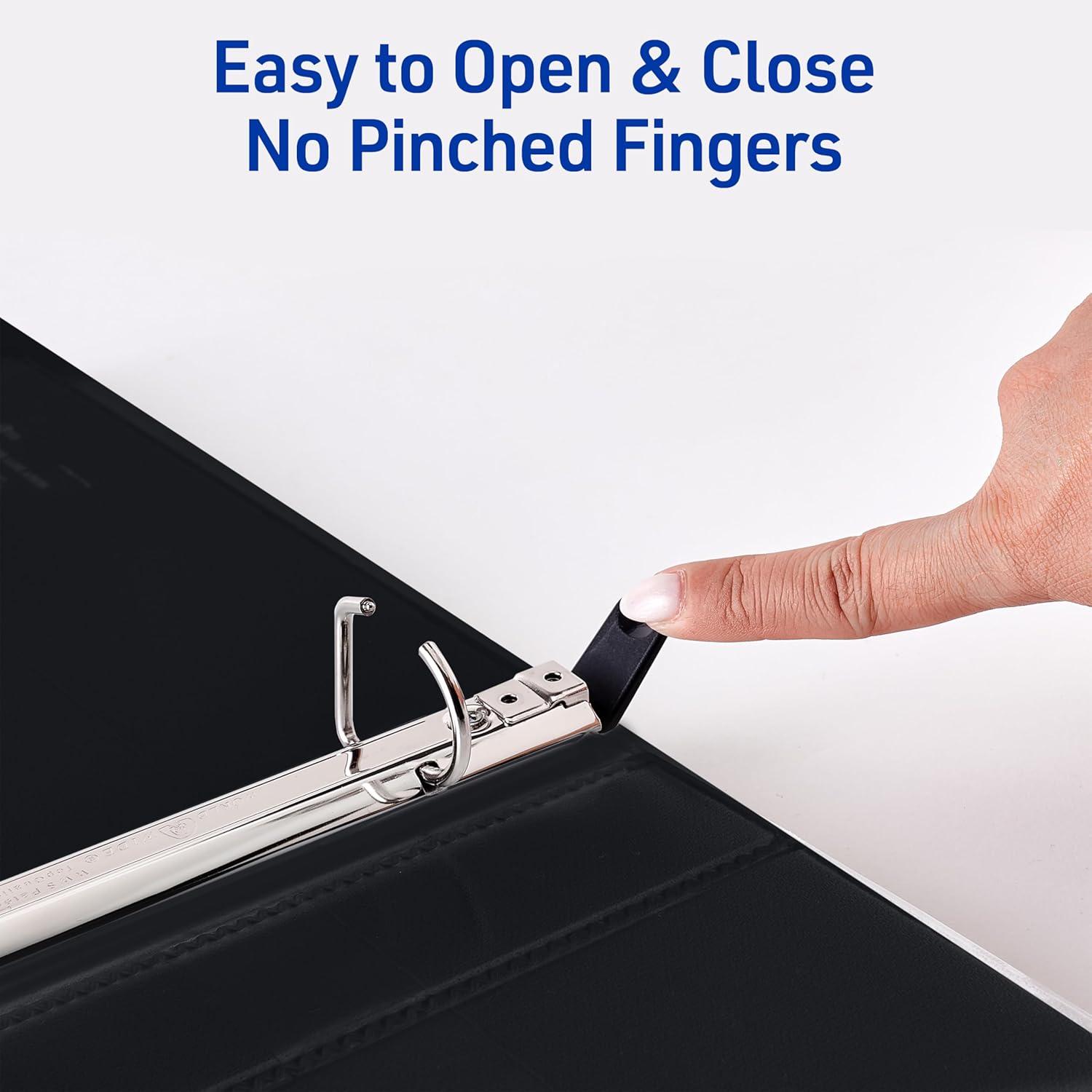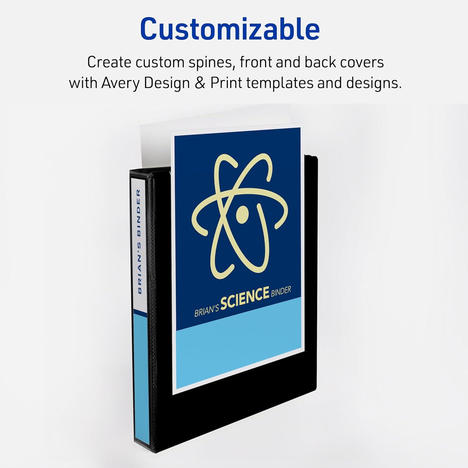 For strong, long-lasting binders that can hang tough with even the most demanding activities, go with this 4-pack of Avery 79868 Heavy Duty 3 Ring Binders. Each 1-inch black binder features a sturdy exterior with a tear-resistant spine (DuraHinge) and more flexible, split-resistant edges (DuraEdge). Plus, the deep-weave polypropylene cover makes it resistant to tears, bubbling, and surface wrinkles. A wider front and back binder panel also ensures that standard dividers and sheet protectors are fully covered. Inside, back-mounted rings ensure pages lay flat and turn easily, while the one-touch design makes opening and closing the rings a breeze. Each 3 ringed binder features a 1.4-inch spine and 1-inch slant rings that hold up to 250 sheets of 8.5″ x 11″ paper, dividers, or sheet protectors. Perfect for use as a report binders, recipe binders, school binders, presentation binders, photo albums, and more. For those who collect trading cards, pair these card binders with Avery's Trading Card Storage Sheets for effortless organization. No matter what you use them for, you can easily personalize your own custom binders using Avery Design & Print Online and the available cover binder templates, fonts, and designs.