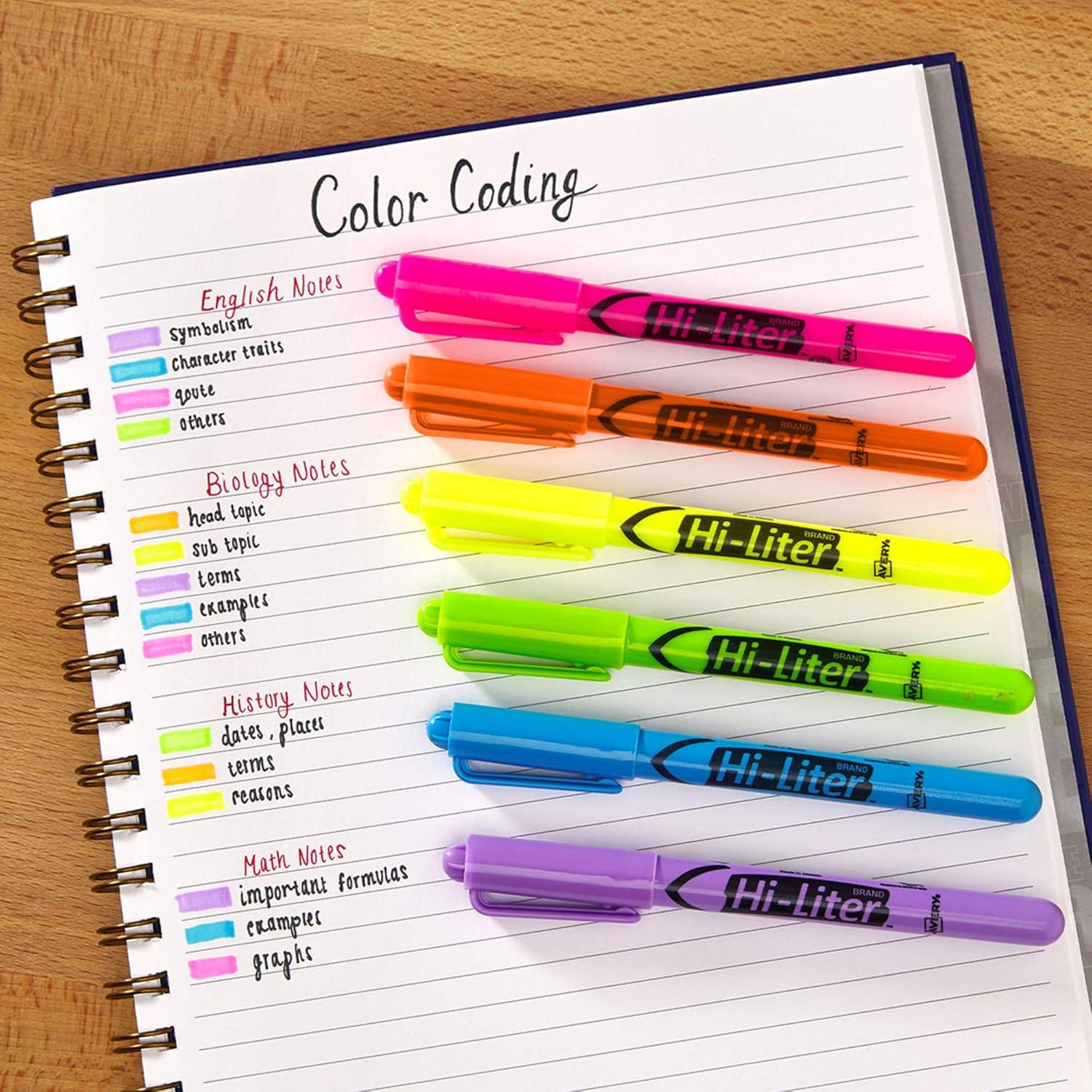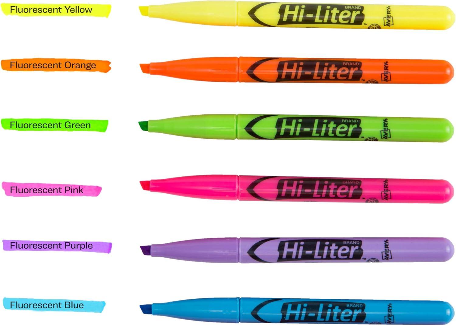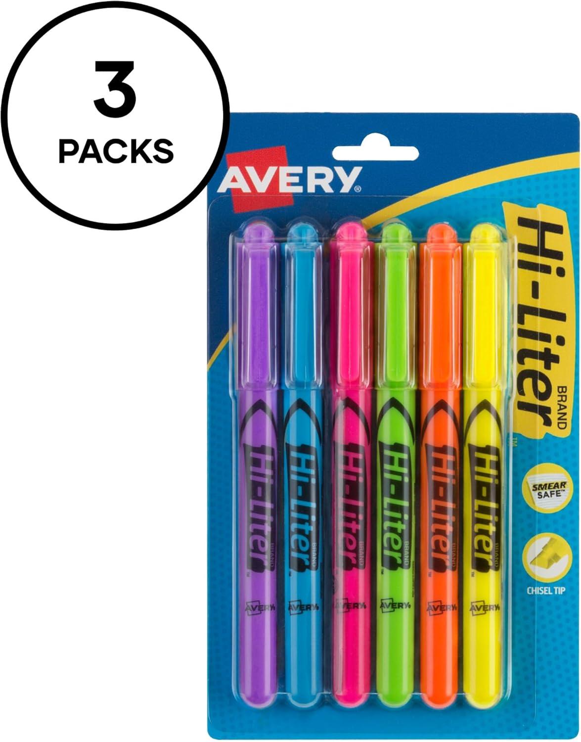 Bring attention to essential words and phrases with Hi-Liter Pen-Style Highlighters. The molded chisel tip of these assorted color highlighters gives you the precision to highlight or underline text in eye-catching fluorescent inks. Keep documents in pristine condition with a smear-safe highlighter ink that doesn’t bleed through most paper and won’t smudge pen, marker or inkjet inks. The pen-style construction makes the highlighter comfortable to handle and features a narrow barrel and a removable cap. Its tip won't fray or mush, and the handy clip lets you carry it with ease in a pocket, tote bag or organizer. The improved ink formula ensures that highlighters can be left uncapped for up to one week without drying out. Don’t worry about getting highlighter ink onto your hands; the water-based ink is easy to wash from skin and is ACMI-certified nontoxic, making these Avery highlighters safe for kids and classroom use. A must-have item for back to school, home and office use, this assorted pack of 6 fluorescent highlighters is perfect for highlighting textbooks, sorting out budgets, test prep, color-coding your planner, as bible highlighters and is a great addition to any list of school supplies or bullet journal supplies. This item comes with 3 packs of 6 assorted color highlighters for a total of 18 highlighters.