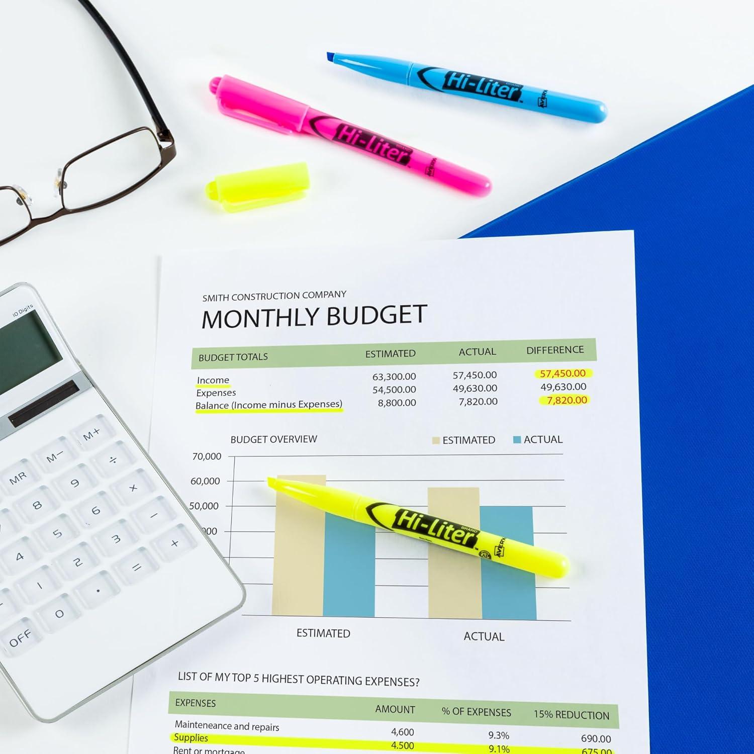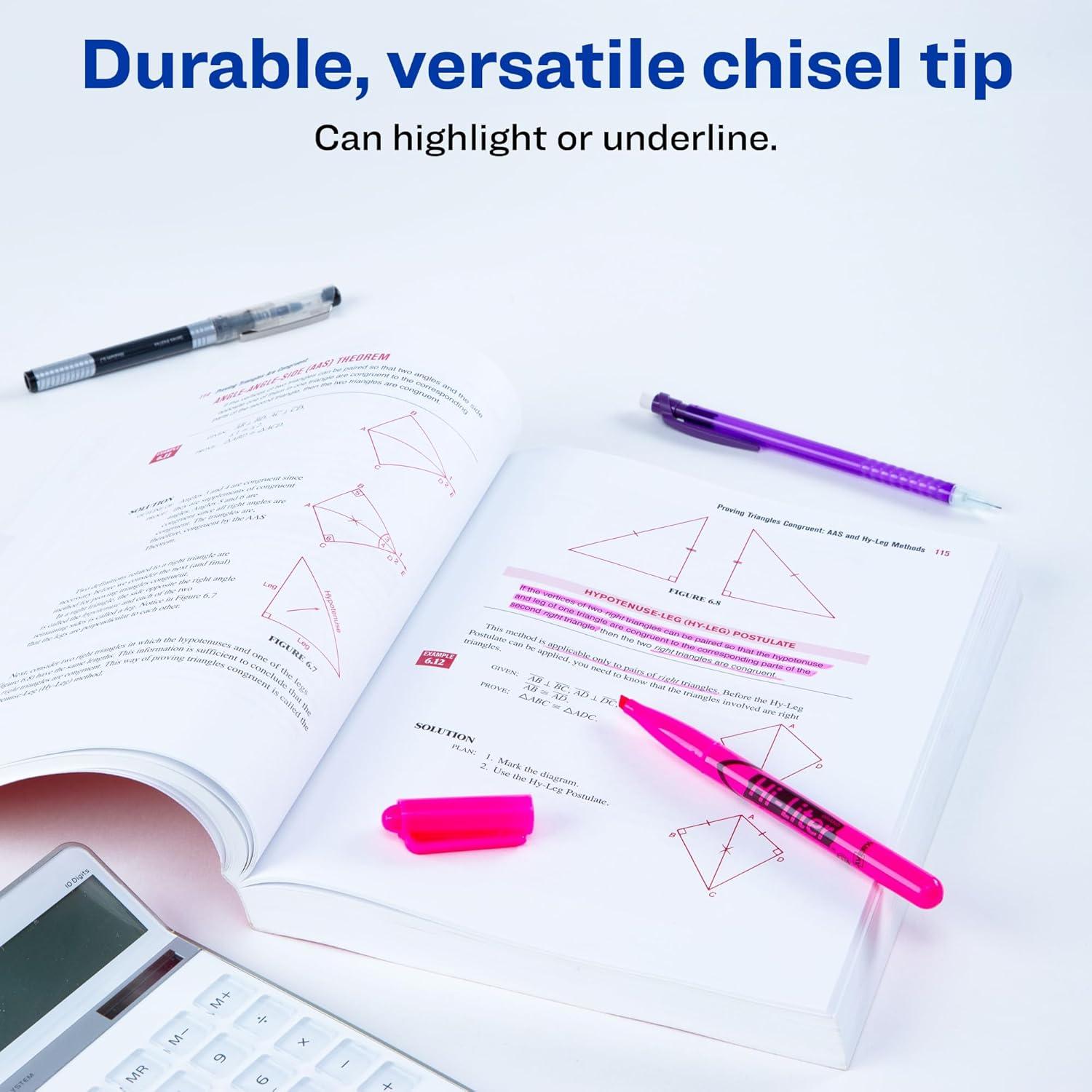 Bring attention to essential words and phrases with Avery Hi-Liter Pen-Style Highlighters. The molded chisel tip of these assorted color highlighters gives you the precision to highlight or underline text in eye-catching fluorescent inks. Keep your documents in pristine condition with a smear-safe highlighter ink that doesn’t bleed through most paper and won’t smudge pen, marker or inkjet inks. The pen-style construction makes the highlighter comfortable to handle and features a narrow barrel and a removable cap. Its tip won't fray or mush, and the handy clip lets you carry it with ease in a pocket, tote bag or organizer. The improved ink formula ensures that highlighters can be left uncapped for up to one week without drying out. Don’t worry about getting highlighter ink onto your hands; the water-based ink is easy to wash from skin and is ACMI-certified nontoxic, making these Avery highlighters safe for kids and classroom use. A must-have item for back to school, home and office use, this assorted pack of 4 fluorescent highlighters is perfect for highlighting textbooks, sorting out budgets, test prep, color-coding your planner, and is a great addition to any list of school supplies or bullet journal supplies. Package includes 1 Fluorescent Green highlighter, 1 Fluorescent Orange highlighter, 1 Fluorescent Pink highlighter and 1 Fluorescent Yellow highlighter.