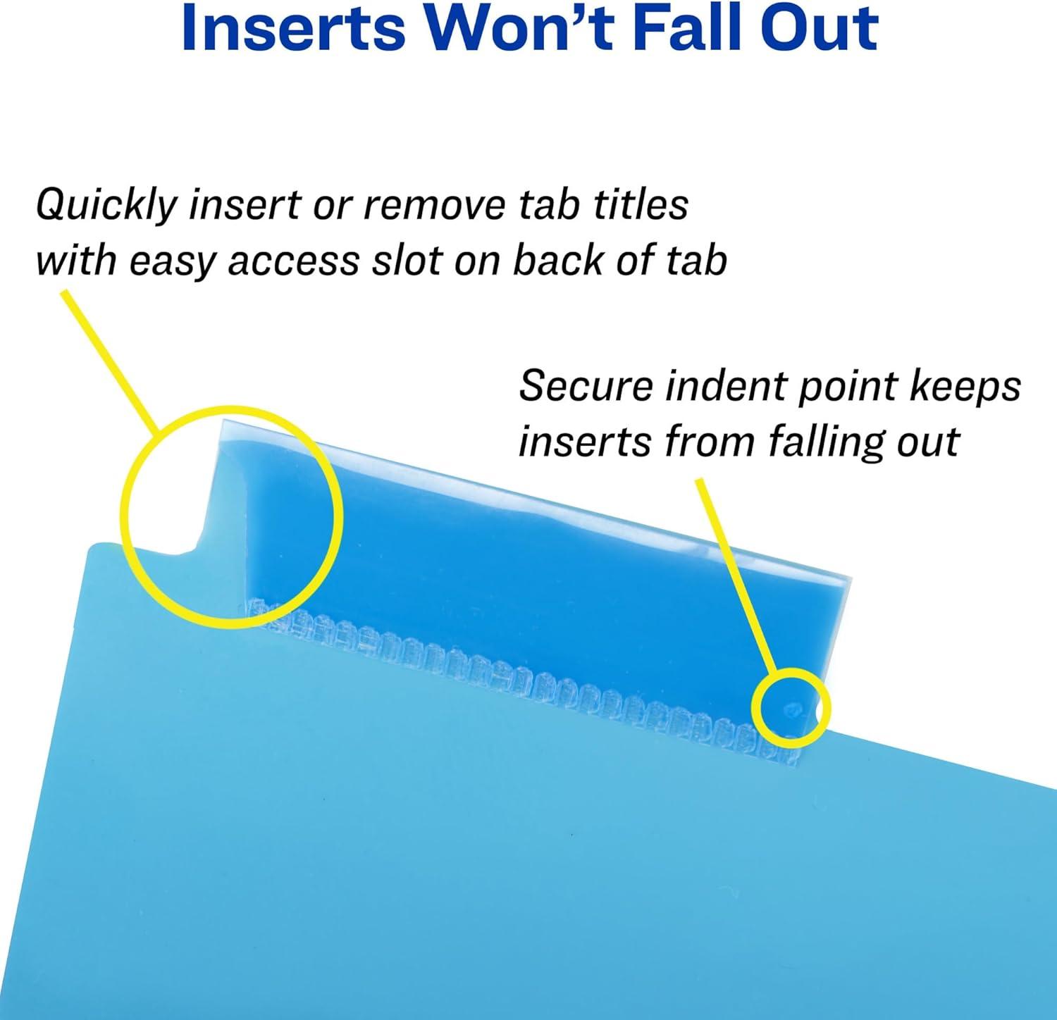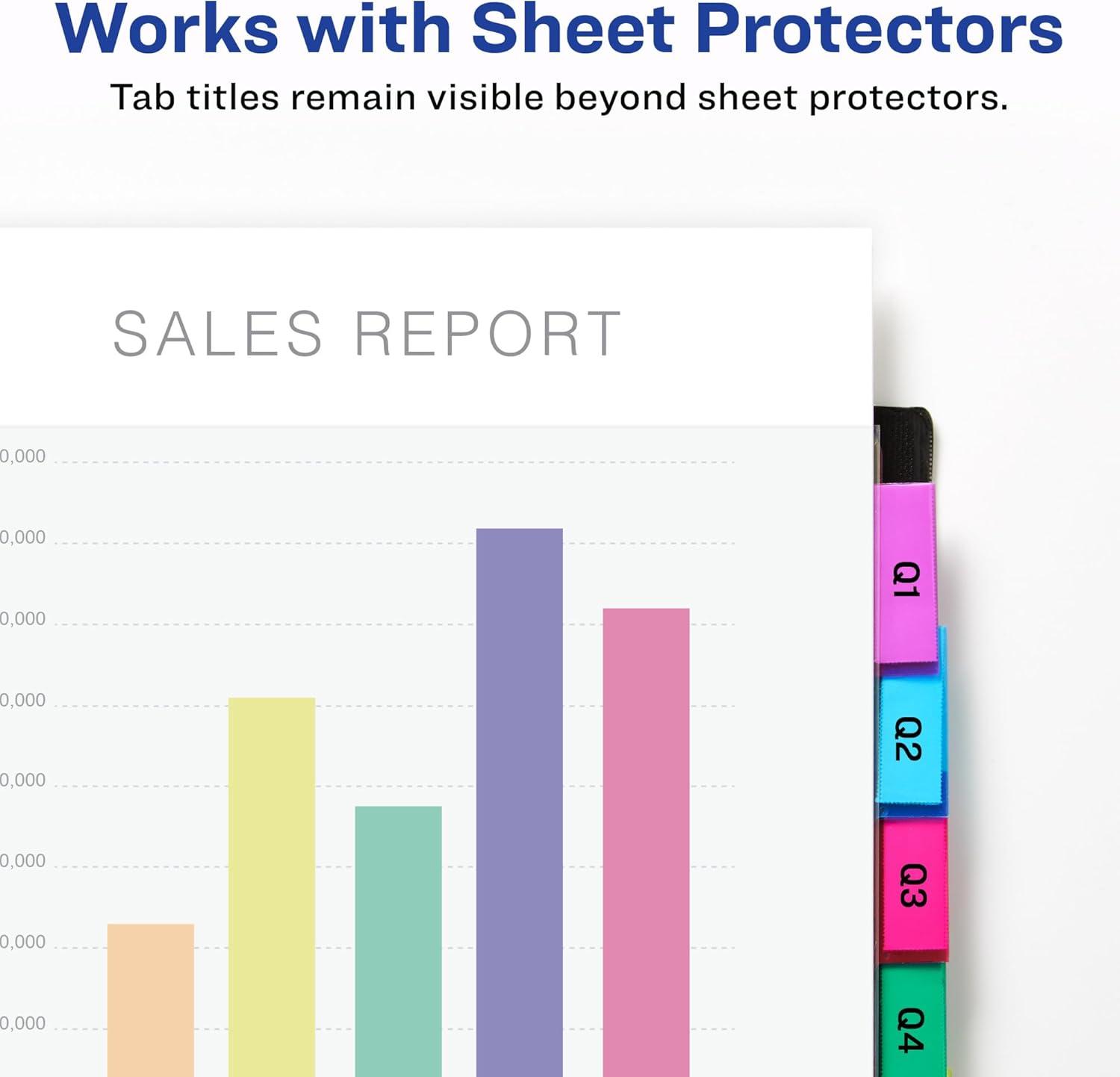 Transform your binder organization with Avery 11989 Big Tab Insertable 5-Tab Dividers for 3-ring binders. The Big Tab design offers 1.5 times more writing space than standard binder divider tabs, giving you room for larger fonts or extra details for better visibility. Ideal for work, school, or home, these binder dividers with pockets are made from sturdy, tear-resistant plastic that wipes clean with most non-abrasive household cleaners to keep your binder neat and presentable. Each divider also features two durable pockets, perfect for managing loose sheets, receipts, handouts, and more. Each durable plastic tab includes a unique indent that holds inserts securely in place, preventing them from falling out. The 3 ring binder dividers with tabs come in vibrant multicolor Neon Brights for quick referencing and color-coding. Use Avery Design & Print, our easy-to-use software, to personalize and print inserts for a polished, professional look, or handwrite directly on the tab inserts for quick customization. Whether you're organizing finances, planning events, or tracking assignments, Avery binder dividers make it easy to stay on top of your tasks. This item includes one set, for a total of 5 dividers.