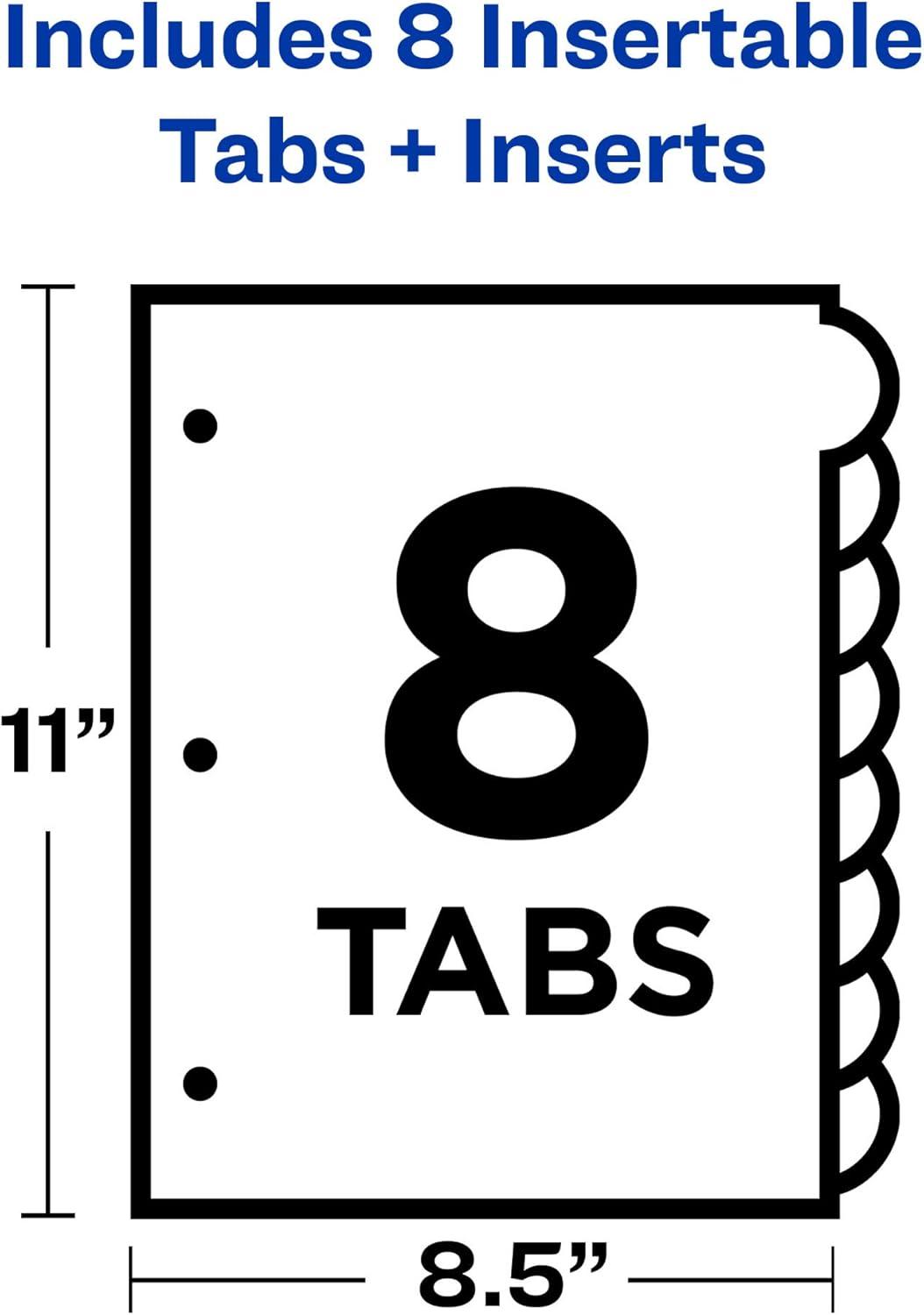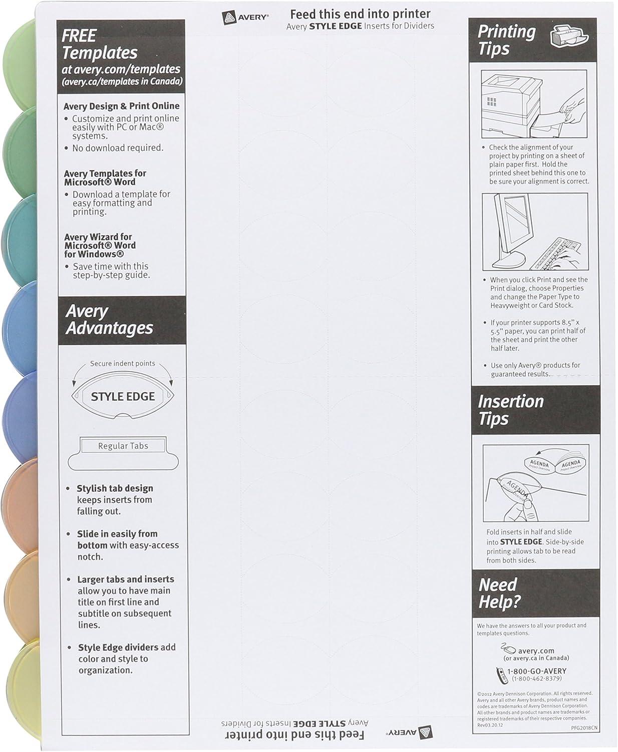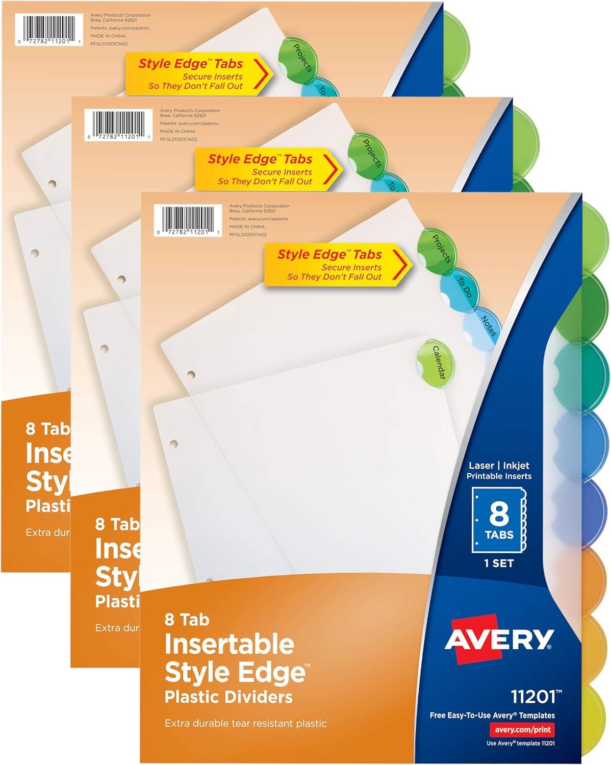 Avery 8-Tab Plastic Binder Dividers with Insertable Style Edge Tabs are a simple yet sophisticated solution to paper organization. Each binder divider with tabs is made of durable, tear-resistant PVC-free plastic, ideal for 3-ring binders with frequently referenced documents. Style Edge divider tabs give your dividers a modern look with a unique oval tab shape and are designed to keep your inserts locked in during use. With these page dividers, you're certain to achieve an organizational edge that's both colorful and attractive. Sturdy and built to withstand everyday use, this multicolor set of translucent plastic 8-tab binder dividers is great for organizing schoolwork, personal finances, recipes, coupons, sheet music, or anything else that needs sorting. These plastic dividers are 3-hole punched and ready for immediate use. For a clean, professional look, personalize your page tab inserts using free templates, fonts and designs on the Avery site. Inserts are compatible with laser and inkjet printers.