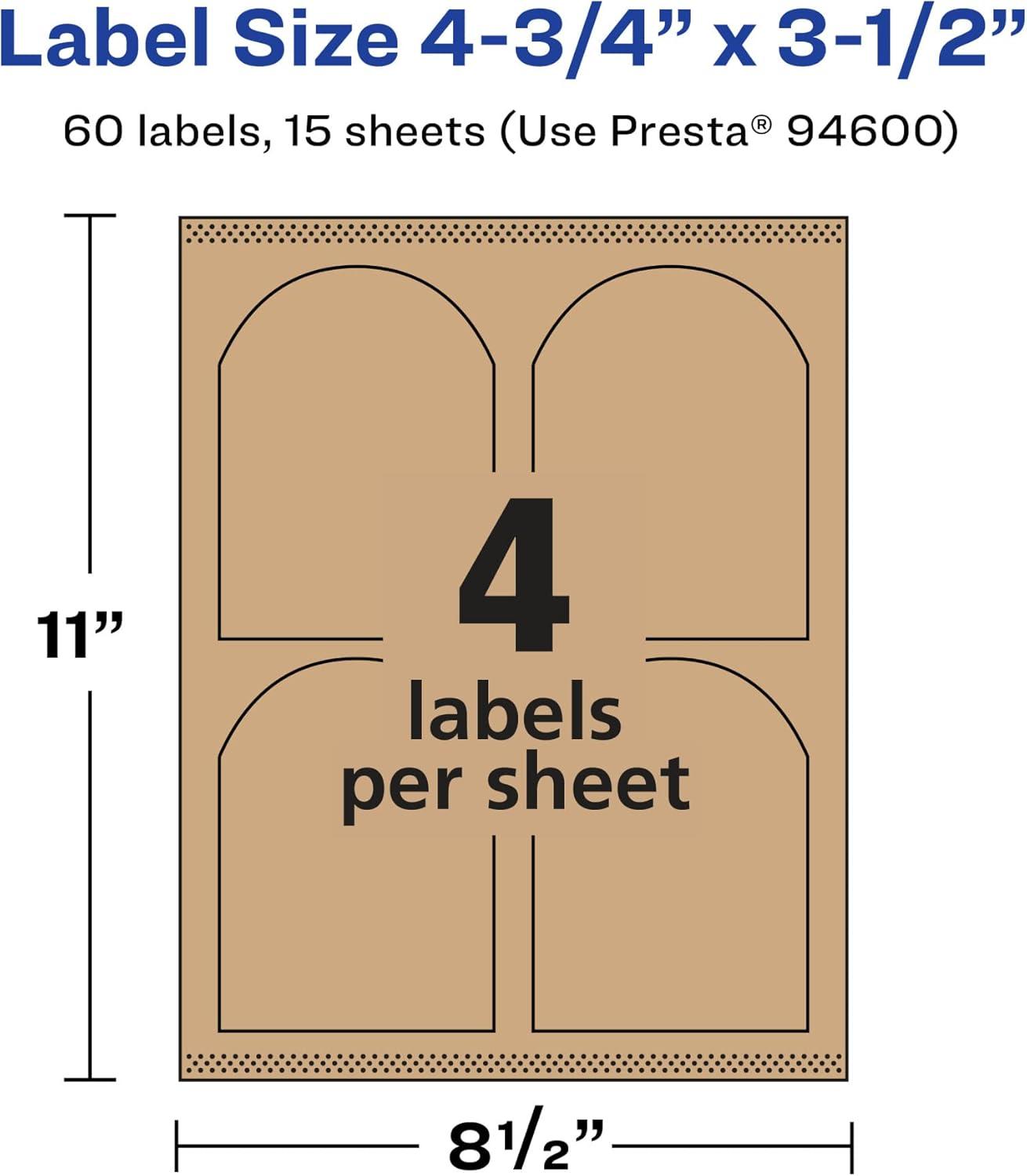 Easily add a rustic finish to crafts, gifts and products with Avery 4.75″ x 3.5″ Kraft Brown Arched Labels. Made with a kraft brown paper material that’s smooth to the touch, Avery kraft brown labels add a natural and handcrafted look to any project. This charming kraft brown material is perfect for adding a little homespun flair to wine bottle labels, candle labels, beer bottle labels, jar labels and more.Avery arched labels are carefully constructed and developed with patented features to provide the best results for every project. Sure Feed technology prevents jams or smudges by creating a more reliable feed through your printer. The print-to-the-edge layout lets you print beautiful full-bleed designs that fill each blank sticker to the edge. The strong permanent label adhesive makes sure that your labels stick and stay to a variety of surfaces without peeling, curling or falling off. Easily customize labels with your own designs, art, symbols and messaging by using the label templates and designs on the Avery website. The intuitive tools make it easy to add your personal touch to any project.