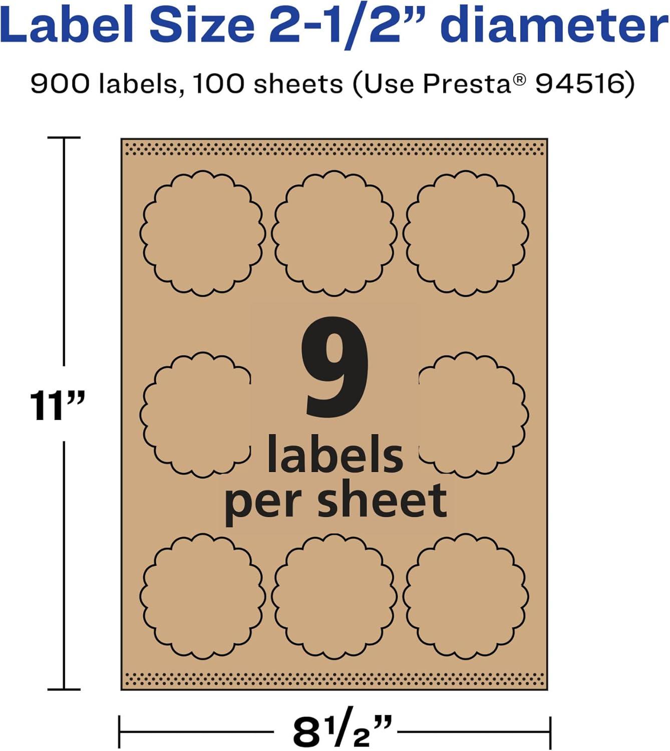 Avery Kraft Brown Round Scalloped Labels, Sure Feed Technology, 2.5″ Diameter, 135 Kraft Brown Labels, Print-to-The-Edge, Laser/Inkjet Printable(900 labels)