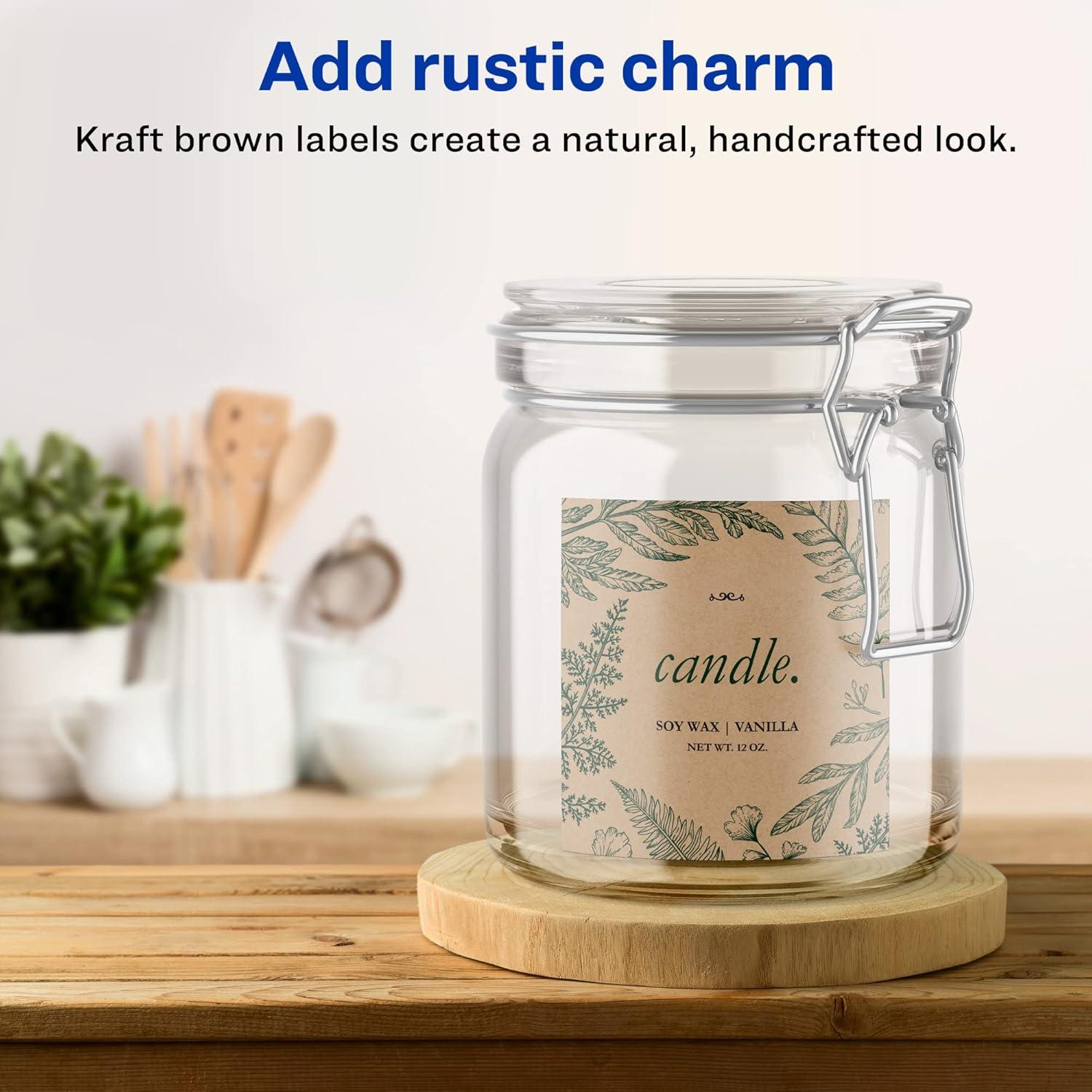 Easily add a rustic finish to crafts, gifts and products with Avery 3″ x 3″ Kraft Brown Square Labels. Made with a kraft brown paper material that’s smooth to the touch, Avery kraft brown labels add a natural and handcrafted look to any project. This charming kraft brown material is perfect for adding a little homespun flair to candle labels, mason jar labels, pricing labels, soap labels, product labels, canning labels, ingredient labels and more.Avery square labels are carefully constructed and developed with patented features to provide the best results for every project. Sure Feed technology prevents jams or smudges by creating a more reliable feed through your printer. The print-to-the-edge layout lets you print beautiful full-bleed designs that fill each blank sticker to the edge. The patented Easy Peel label design makes these labels easy to peel and quick to apply. Just bend the label sheet, peel off your labels and fold the sheet back flat. The strong permanent label adhesive makes sure that your labels stick and stay to a variety of surfaces without peeling, curling or falling off. Easily customize labels with your own designs, art, symbols and messaging by using the label templates and designs on the Avery website. The intuitive tools make it easy to add your personal touch to any project.