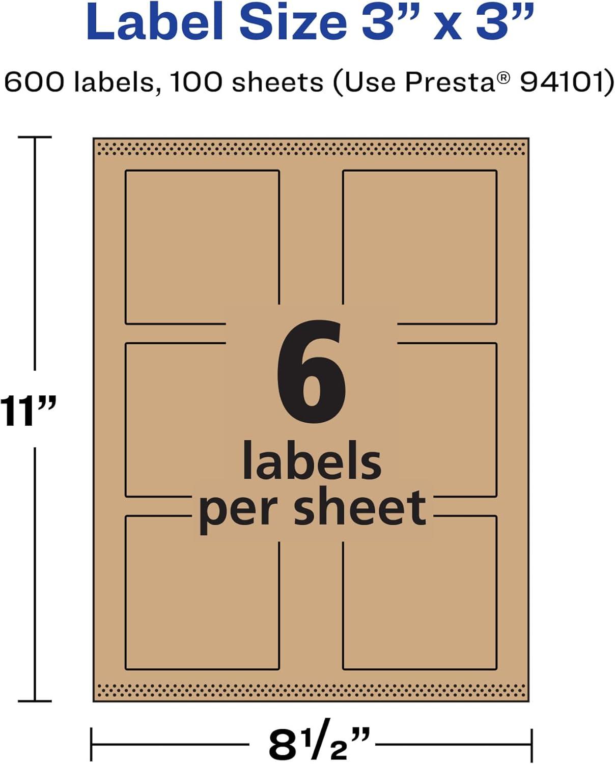 Avery Kraft Brown Square Labels, Sure Feed Technology, 3″ x 3″, 90 Kraft Brown Labels, Print-to-The-Edge, Laser/Inkjet Printable(600 labels)
