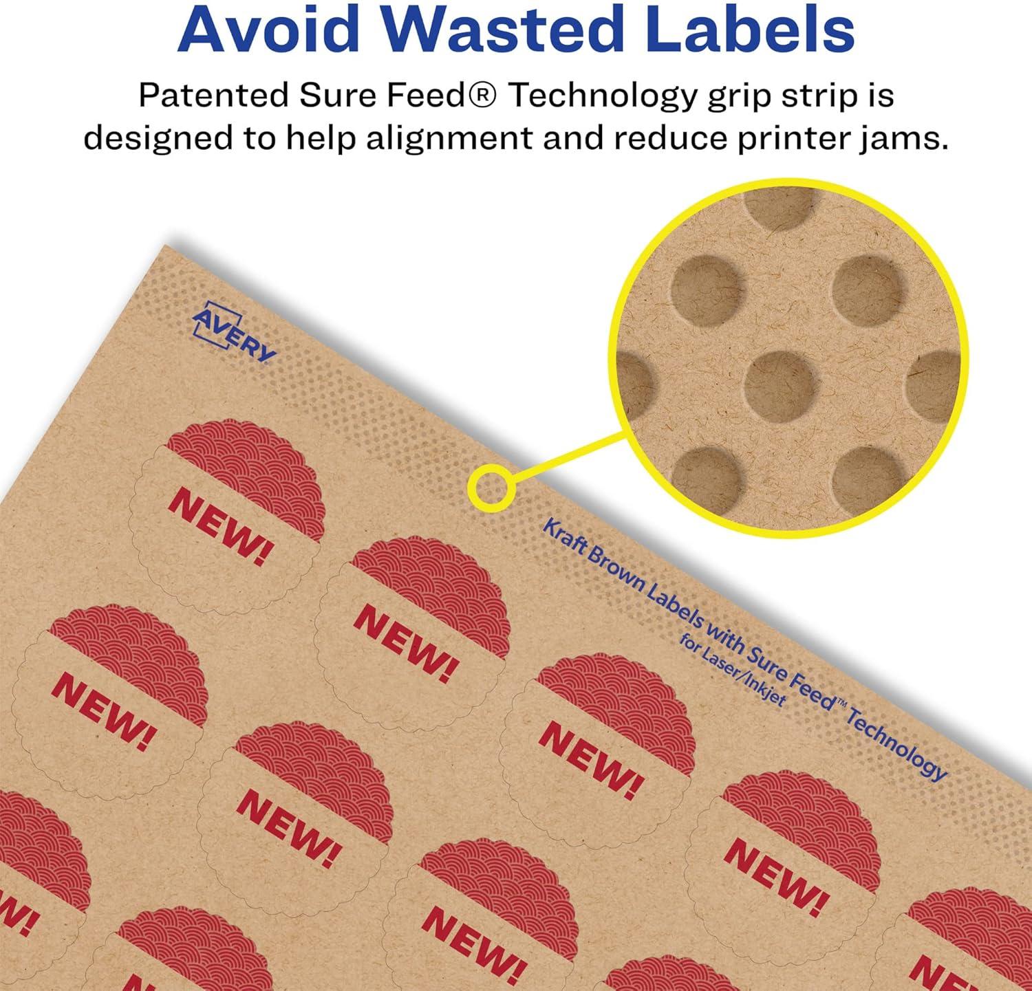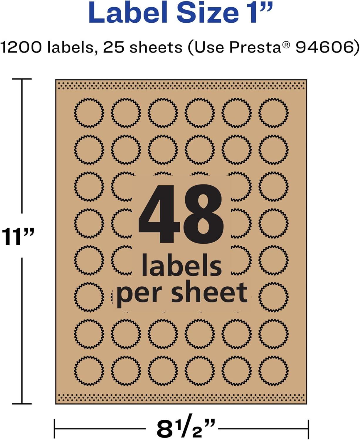 Easily add a rustic finish to crafts, gifts and products with Avery 1″ Kraft Brown Starburst Labels. Made with a kraft brown paper material that’s smooth to the touch, Avery kraft brown labels add a natural and handcrafted look to any project. This charming kraft brown material is perfect for adding a little homespun flair to reward stickers for kids, certificate seals, decorative labels, mailing seals, planner stickers and more.Avery starburst labels are carefully constructed and developed with patented features to provide the best results for every project. Sure Feed technology prevents jams or smudges by creating a more reliable feed through your printer. The print-to-the-edge layout lets you print beautiful full-bleed designs that fill each blank sticker to the edge. The strong permanent label adhesive makes sure that your labels stick and stay to a variety of surfaces without peeling, curling or falling off. Easily customize labels with your own designs, art, symbols and messaging by using the label templates and designs on the Avery website. The intuitive tools make it easy to add your personal touch to any project.