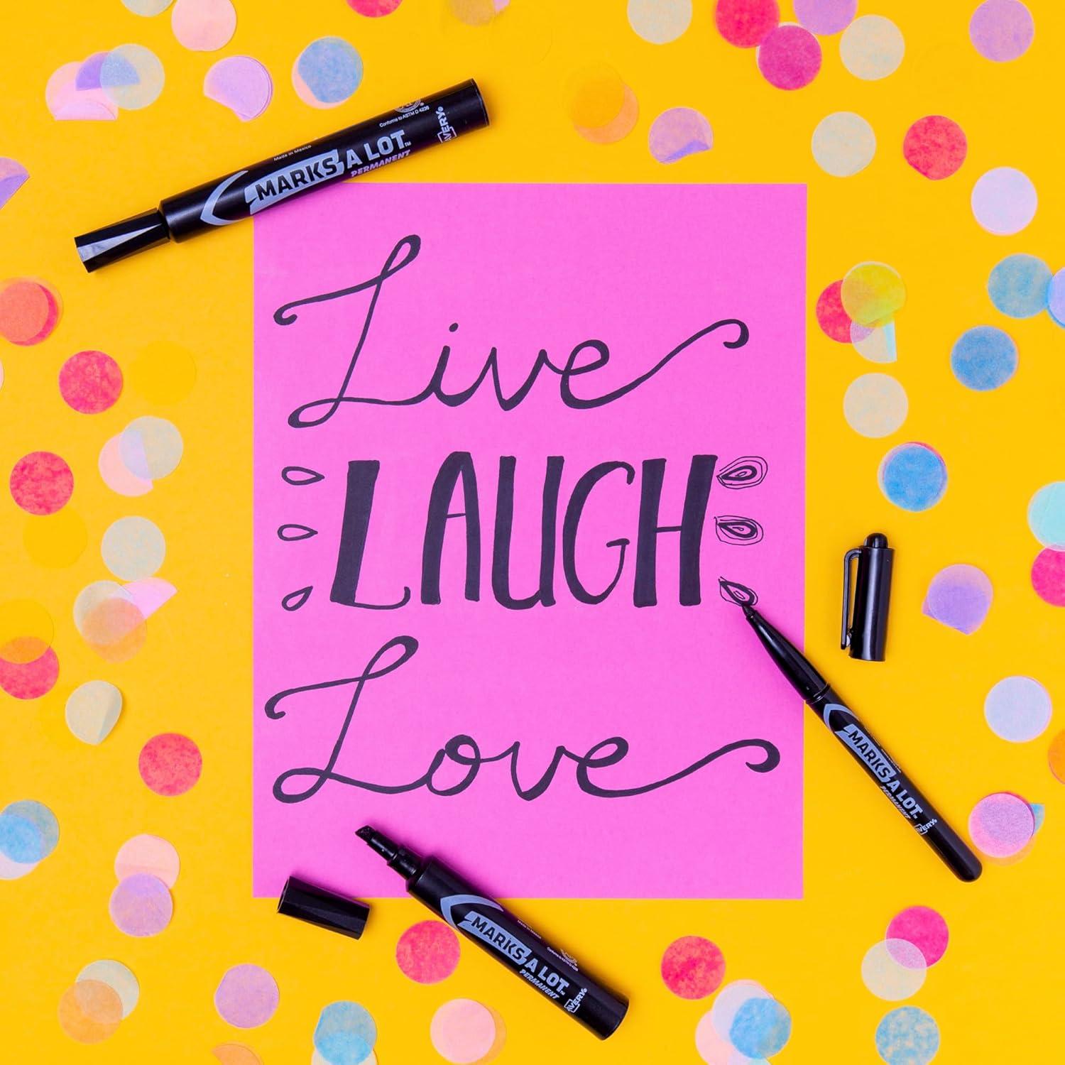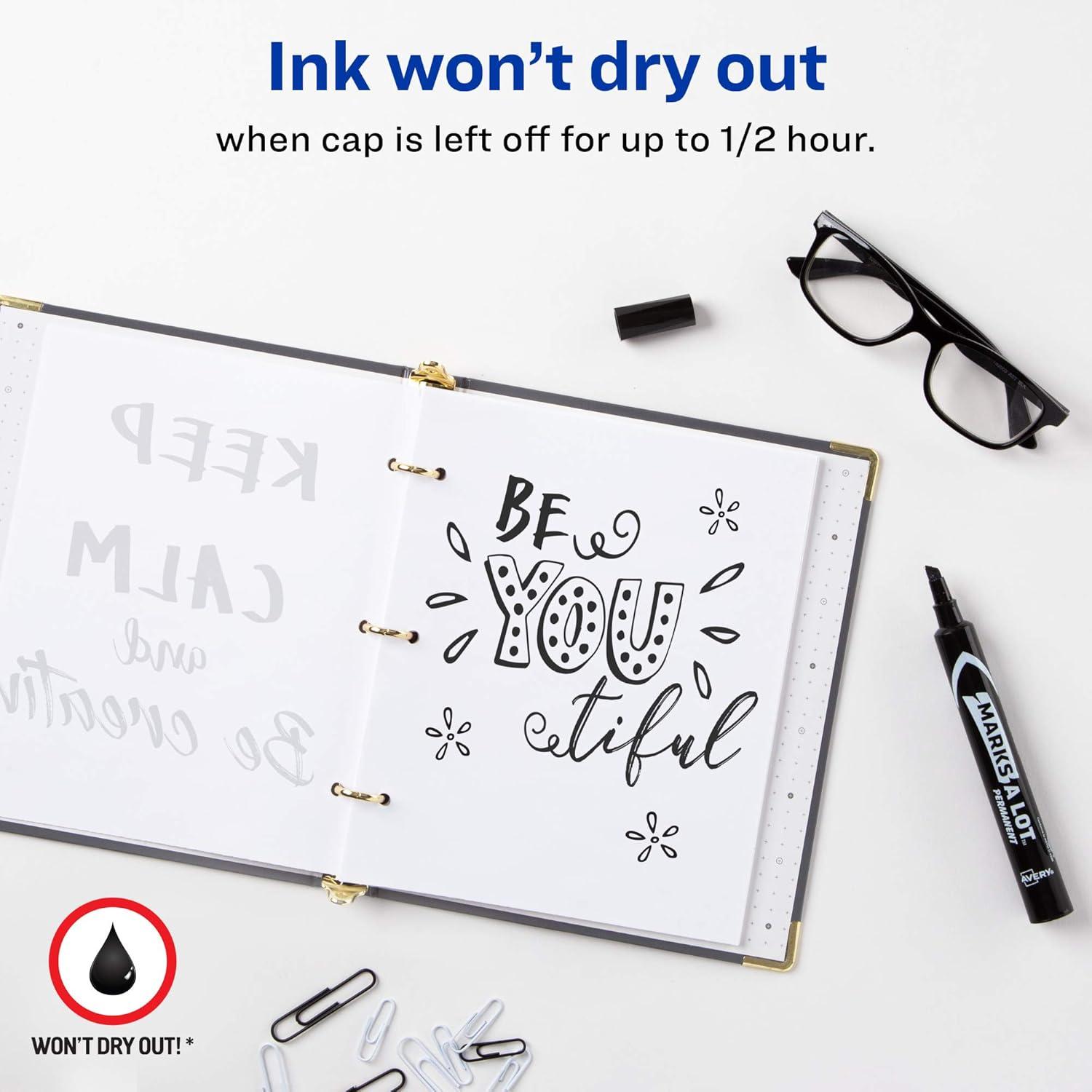Avery Marks-a-Lot permanent markers are perfect for any project you may have and will never fade! Our markers are permanent on nearly every surface, including cardboard, wood, metal, plastic, PVC, and more! The water and fade resistant ink make them ideal for both indoor and outdoor projects, especially signs and banners for parties and garage or yard sales. Unlike fine point markers, the chiseled tip on our markers allows you to control how wide or thin to make each line. Our markers are best for writing clear writing as you don’t have to wait for the ink to dry and you never have to worry about smearing the ink, unlike with most paint markers! Unlike with fine point markers, the strong chisel tip on our markers allows you to control how wide or thin each line is. The desk-style markers are great additions for any office or crafting kit. The low odor non-toxic ink means these markers are safe for not just adults but also kids and can be used in classrooms. The bold edges and ink create clear, precise lines that can be seen from afar, making them perfect for posters and presentations in the classroom and conference room. Purchasing this bulk set of 12 will allow you to have a marker for your desk, children, craft room, and wherever else you may need one!