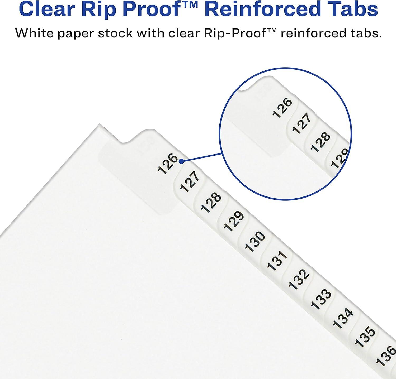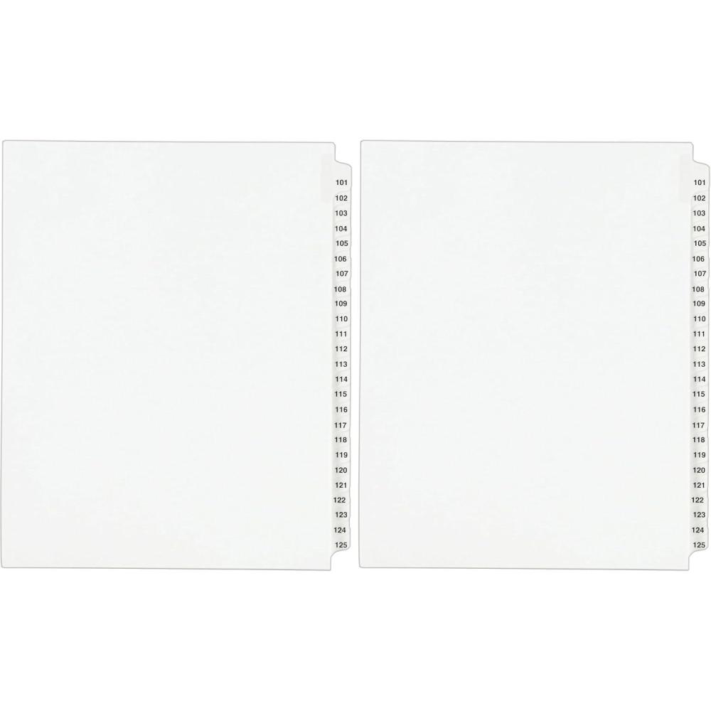You have the right to organized and professional-looking files. This Standard Collated Legal Divider Set features Tabs 101-125 so it's perfect for index briefs, legal exhibits, mortgage documentation files and more. White paper stock with clear, Rip Proof reinforced tabs are preprinted on both sides using Helvetica bold type for ease of use, and the unpunched binding edge gives you the freedom to fit practically any binding system. Here's evidence these dividers will do your files justice.