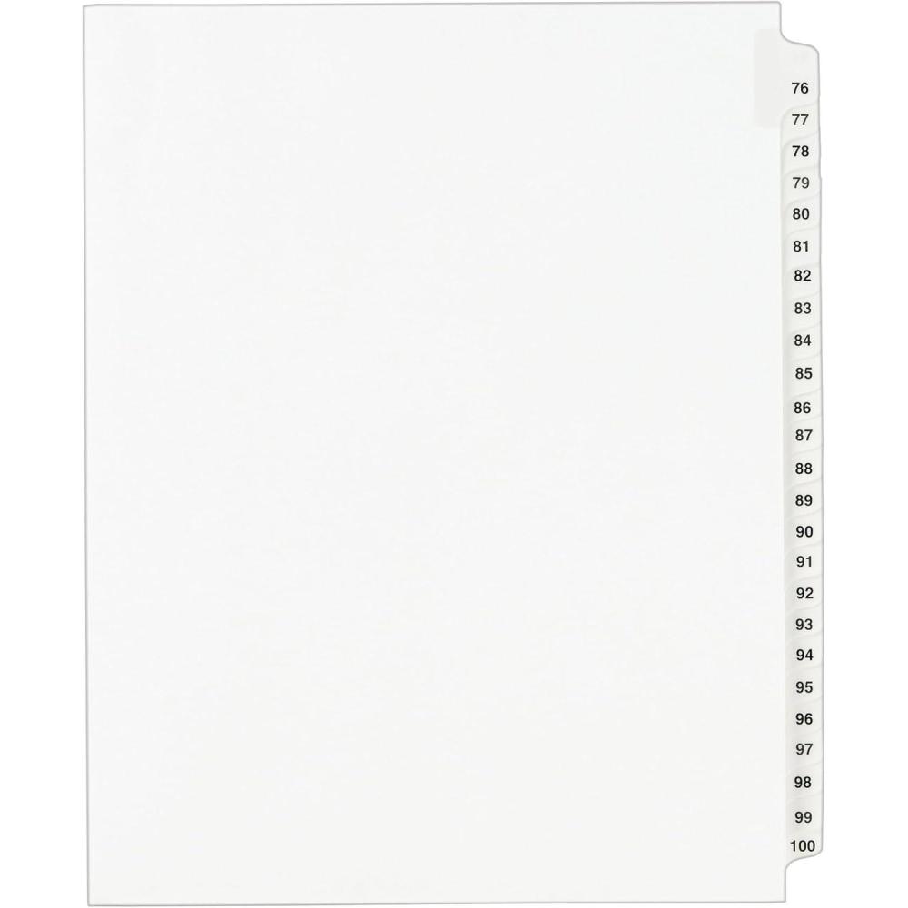 You have the right to organized and professional-looking files. This Standard Collated Legal Divider Set features Tabs 76-100 so it's perfect for index briefs, legal exhibits, mortgage documentation files and more. White paper stock with clear, Rip Proof reinforced tabs are preprinted on both sides using Helvetica bold type for ease of use, and the unpunched binding edge gives you the freedom to fit practically any binding system. Here's evidence these dividers will do your files justice.