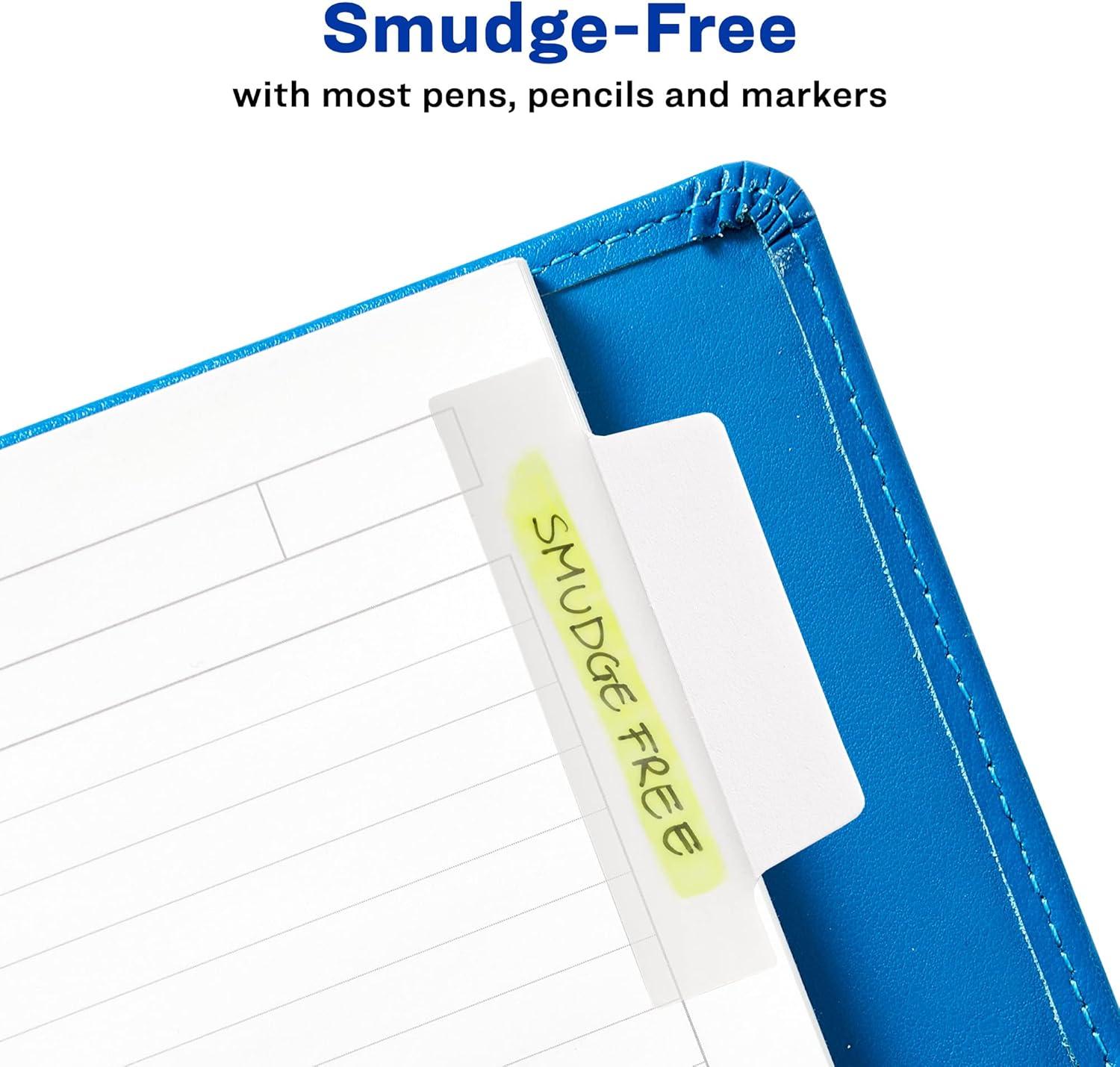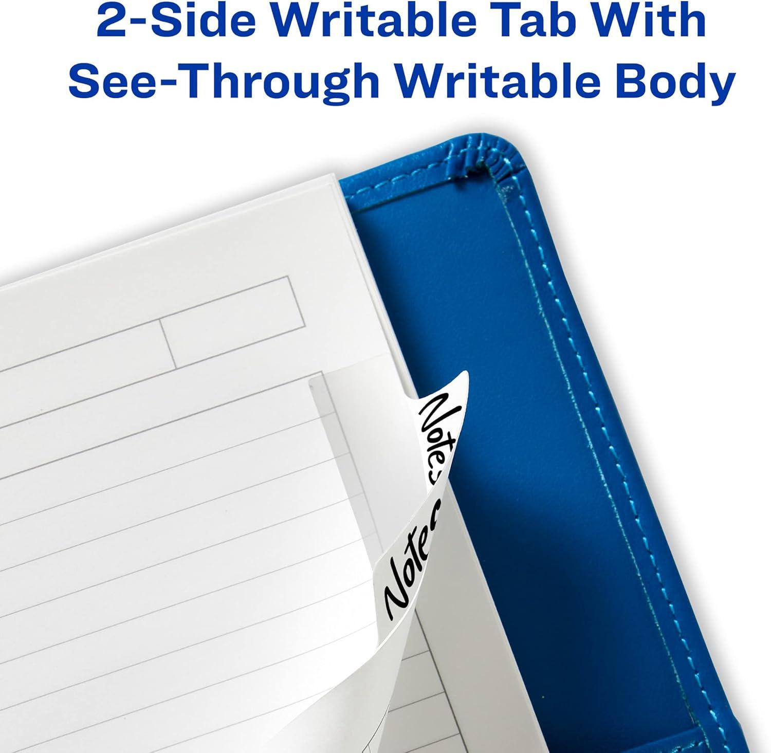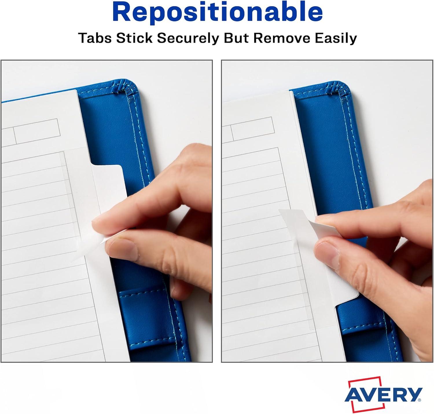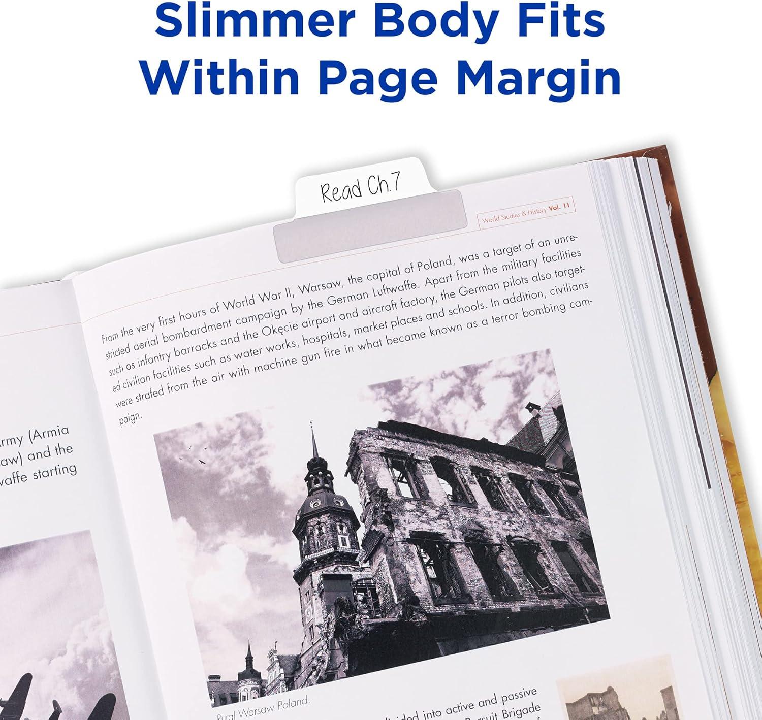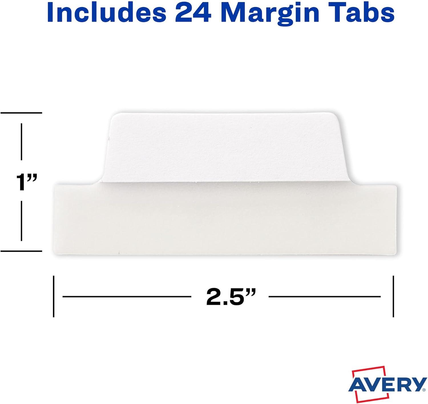 Avery Margin Ultra Tabs offer a narrow body that fits within the margins of books, notebooks and printed documents without interfering with text. This makes indexing, flagging and referencing documents quick and easy. The durable tabs are writable on both sides and the adhesive body is clear so you can see any text underneath. Enjoy crisp, smudge free* writing on page tabs with most pens, pencils, markers and highlighters. These repositionable tabs stick securely, but remove easily without leaving any residue or lifting ink. Perfect for home organization; use these sticky tabs as page flags in magazines, bible tabs for passages or recipe index tabs in cookbooks. Students, teachers and administrators will find it easy to highlight textbooks and notes without marking the pages. At the office, make quick and easy sticky notes in your weekly or monthly planner and mark items in a report or presentation for referencing, follow up or signatures.*Ink dry times may vary. Tab may lift some inks. Test before applying. The pack includes 24 white tabs.