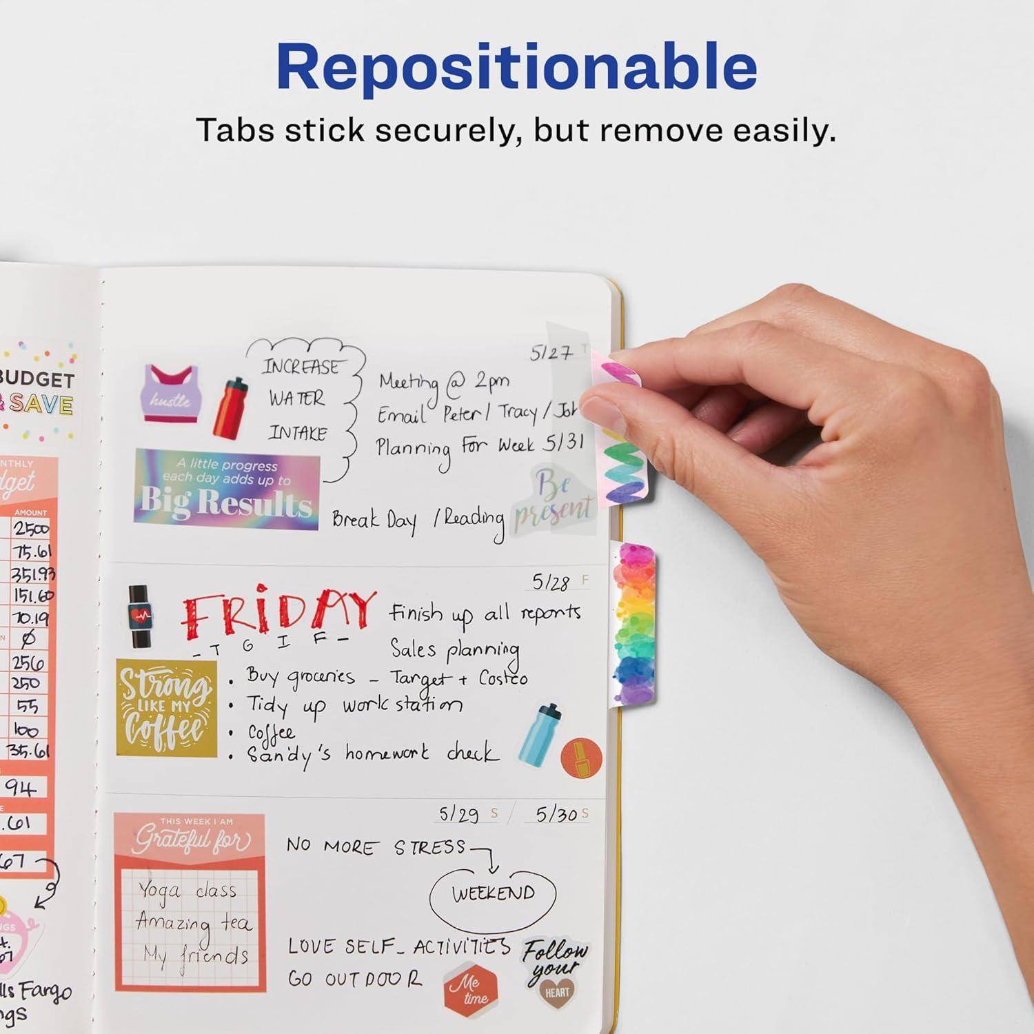 Repositionable sticky tab adhesive keeps tabs secure and also removes cleanly to avoid residue and damage