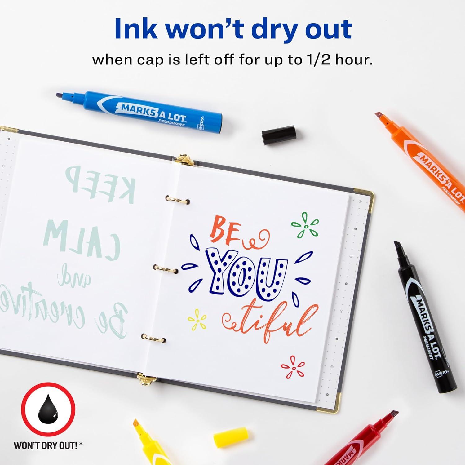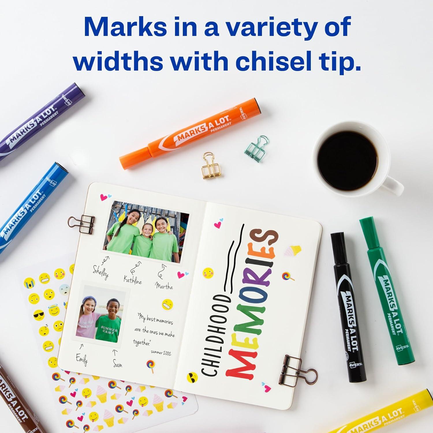Make your mark on the world with this set of Avery Marks-A-Lot assorted markers. These large, thick markers hold over 30% more ink than regular desk-style markers. The resilient chisel tip stays solid even with frequent use and is great for creating various different line widths. The versatile, permanent marker ink dries quickly when used but won't dry out if you forget the cap. Leave the cap off for up to half an hour and you will still be able to pick the marker back up and keep writing. The permanent ink resists wear and water exposure and is perfect for any use. 12 assorted markers are included in 8 vibrant colors (3 black markers, 2 red markers, 2 blue markers, 1 green marker, 1 brown marker, 1 yellow marker, 1 purple marker, 1 orange marker), These markers work with multiple surfaces including paper, cardboard, metal, PVC, concrete, plastic and ceramic. Write on sports equipment, make signs for yard sales, mark boxes and more. Marks-A-Lot chisel tip markers are great everywhere from classrooms and offices to warehouses and manufacturing facilities. Avery Marks-A-Lot permanent markers are also low-odor and nontoxic so that they can be safe in classrooms as well as in laboratories. The ink is ACMI certified as nontoxic and conforms to ASTM D4236.