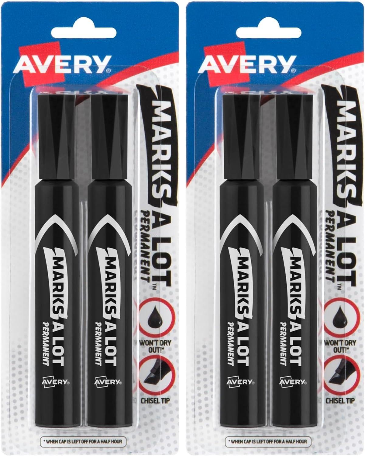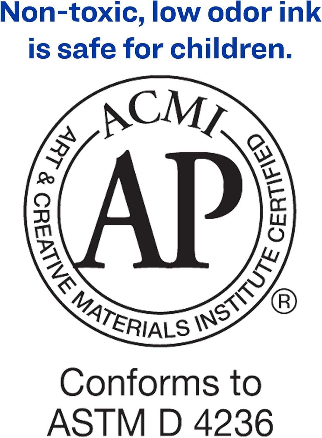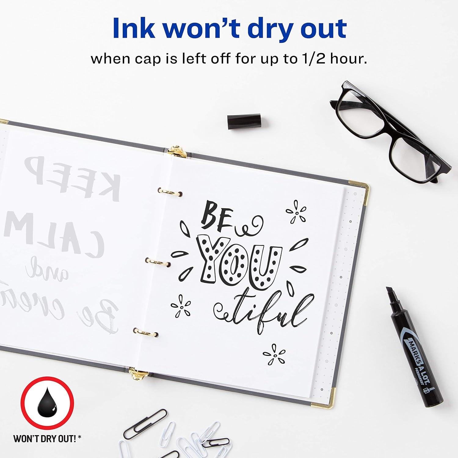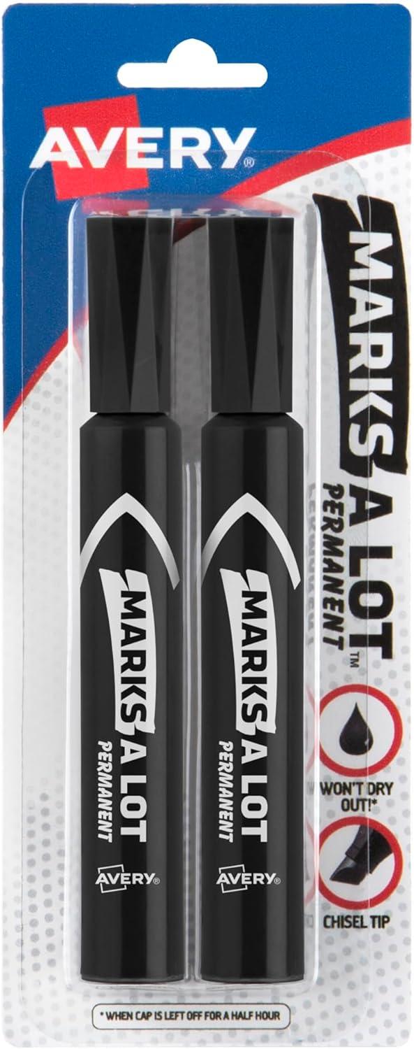Make your mark on the world with Avery Marks-A-Lot permanent markers. The resilient chisel tip stays solid even with frequent use and is great for creating various different line widths. The versatile, permanent blue marker ink dries quickly when used but won't dry out if you forget the cap. Leave the cap off for up to half an hour and you will still be able to pick the marker back up and keep writing. The blue permanent marker ink resists wear and water exposure and is perfect for any use. These markers work with multiple surfaces including paper, cardboard, metal, PVC, concrete, plastic and ceramic. Write on sports equipment, make signs for yard sales, mark boxes and more. Marks-A-Lot chisel tip markers are great everywhere from classrooms and offices to warehouses and manufacturing facilities. Avery Marks-A-Lot permanent markers are also low-odor and nontoxic so that they can be safe in classrooms as well as in laboratories. The ink is ACMI certified as nontoxic and conforms to ASTM D4236.