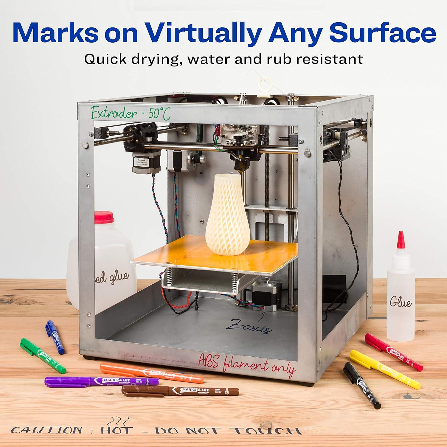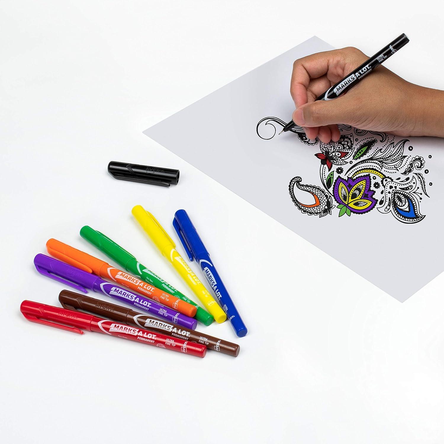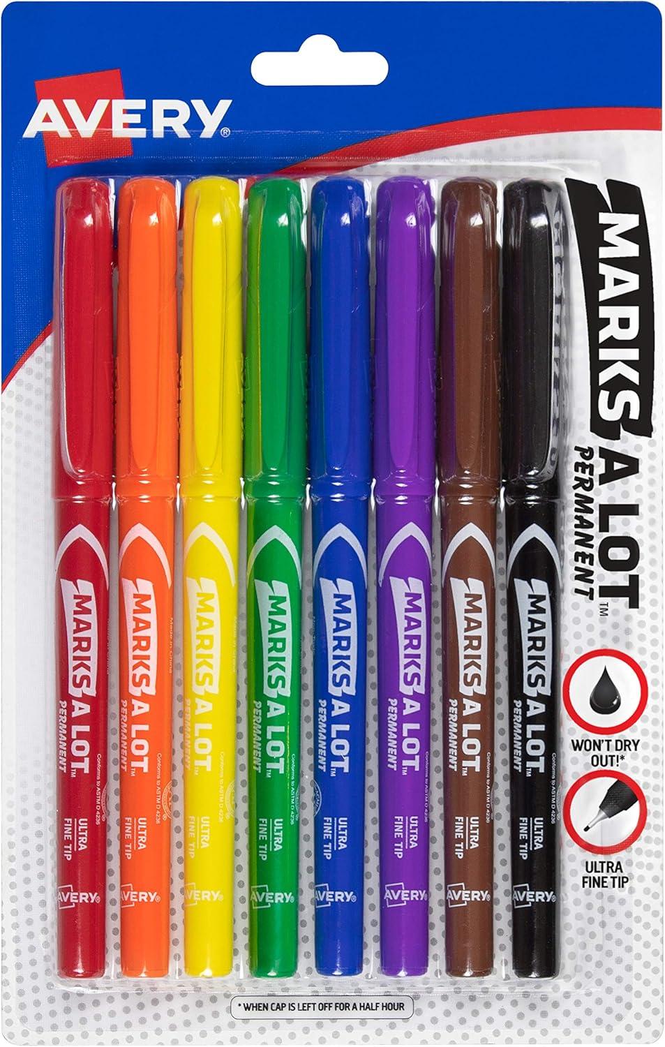 Create confident and razor sharp lines with Avery Marks-A-Lot ultra fine markers. Thin but also sturdy, the 0.5 mm marker tip stays solid and does not fray over time. The versatile, permanent marker ink dries quickly when used but won't dry out if you forget the cap. Leave the cap off for up to half an hour and you will still be able to pick the marker back up and keep writing. The permanent ink resists wear and water exposure and is perfect for any project. These markers work with almost any surface including paper, cardboard, metal, PVC, concrete, plastic and ceramic. Whether it's your bullet journal, planner, water bottle or phone case, these ultra fine permanent markers can go wherever you need them. Avery Marks-A-Lot permanent markers are also low-odor and nontoxic so that they can be safe in the classroom, the home, or even in laboratories. The ink is ACMI certified as nontoxic and conforms to ASTM D4236.
