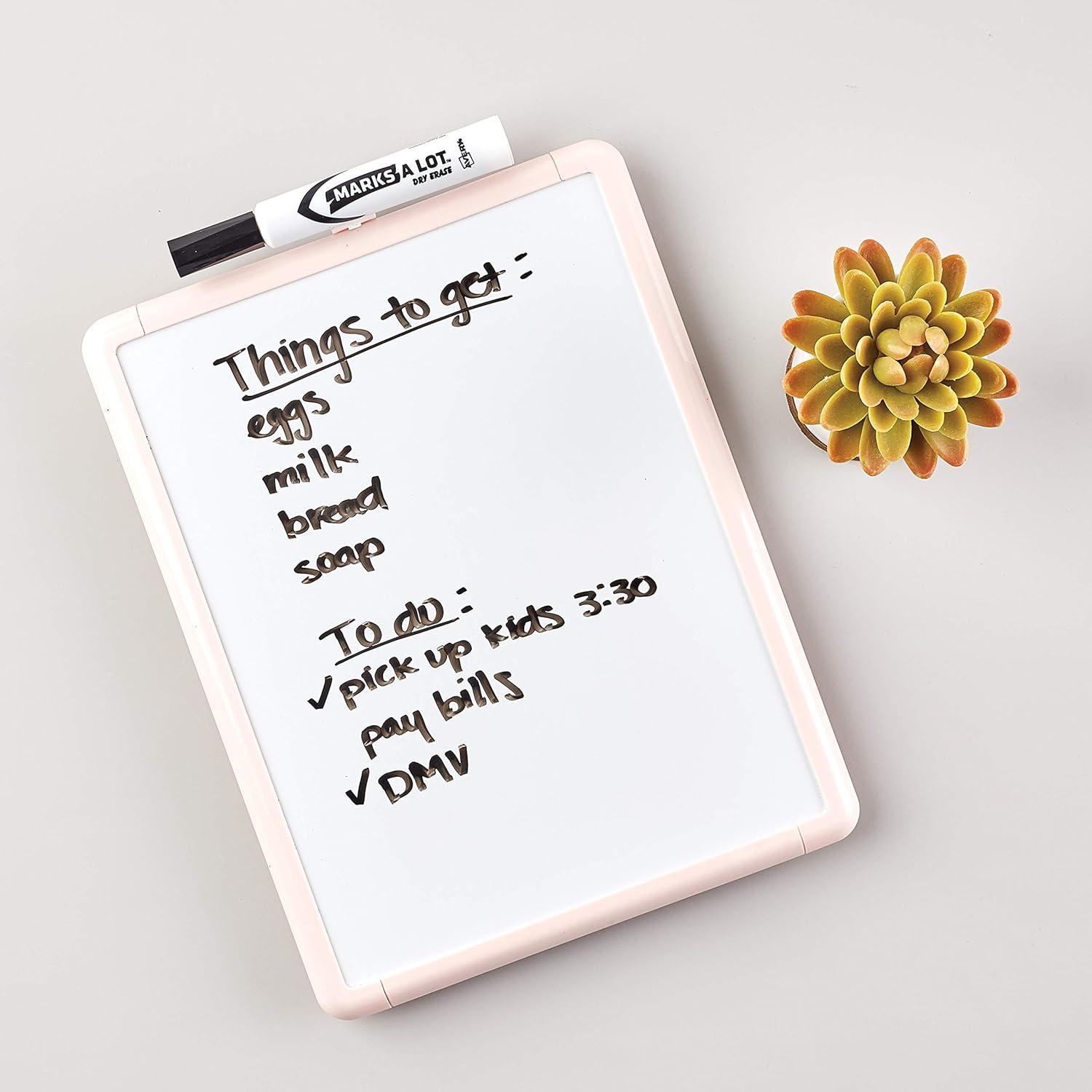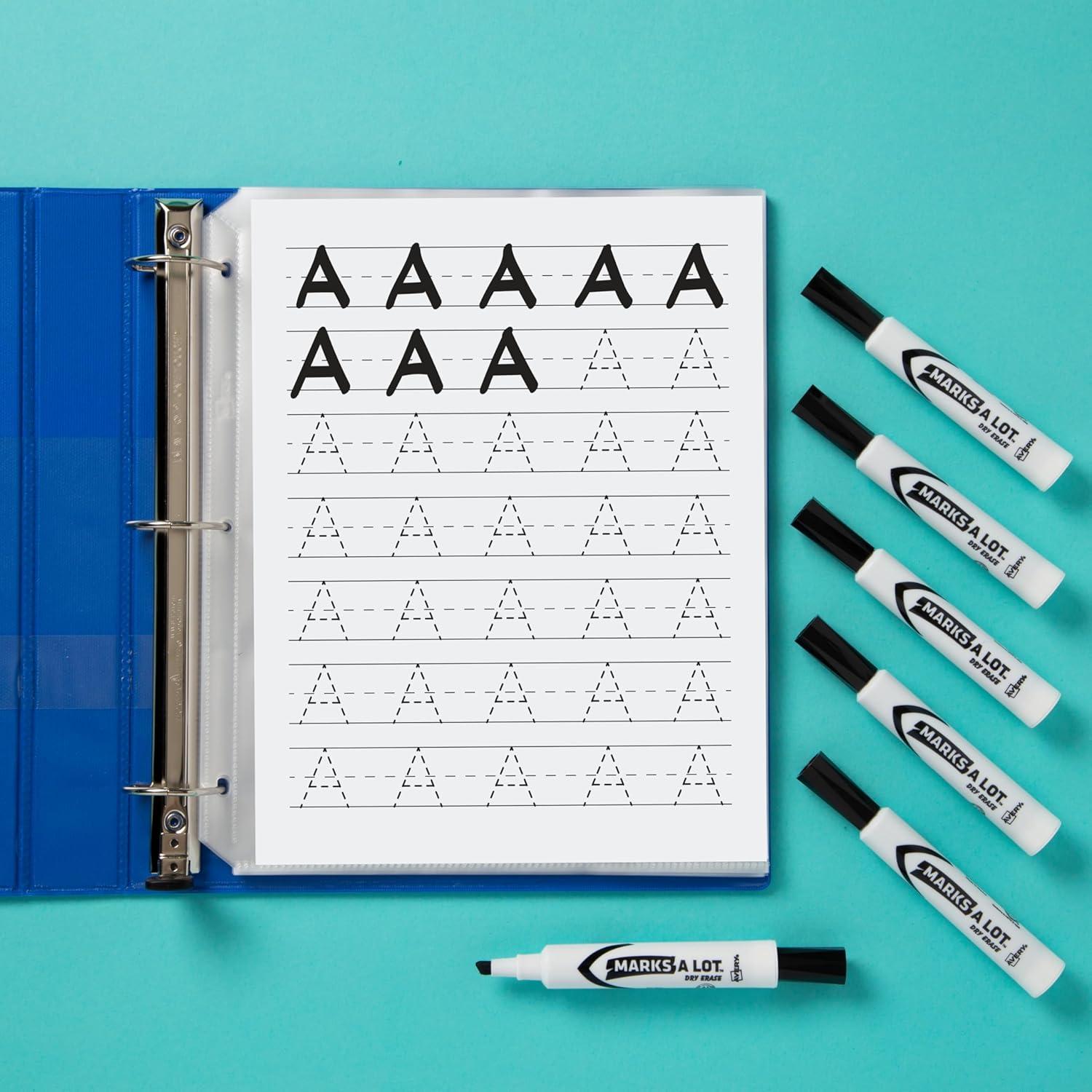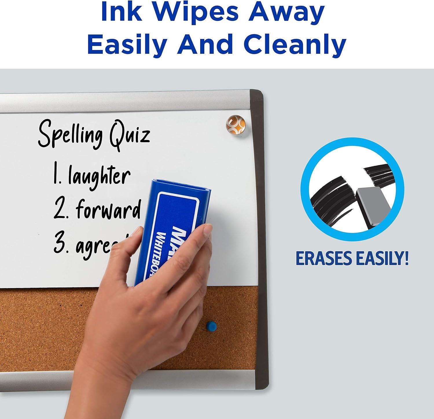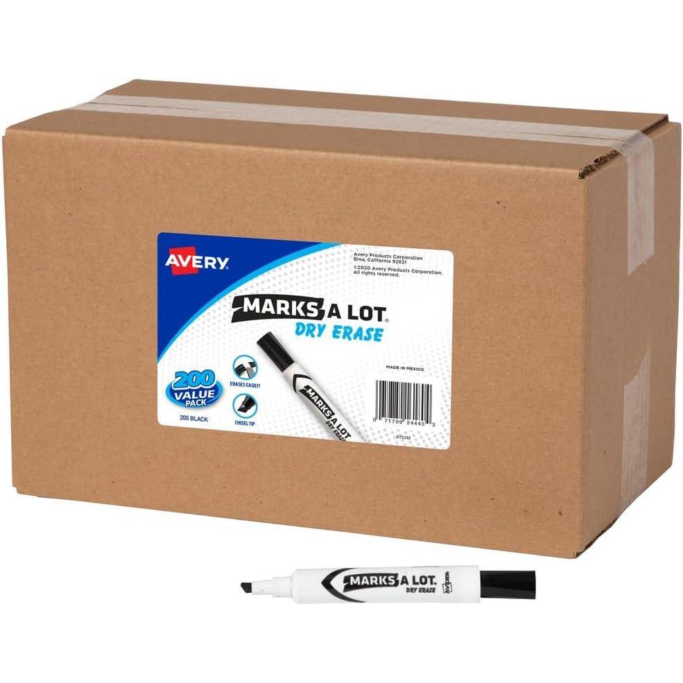 Get your thoughts acorss in black. The bold ink is formulated to last; even if the cap is left off for 24 hours there’s no dry-out. Marks A Lot Dry Erase Markers help you convey your thoughts clearly and precisely with the fine point bullet tip. Catch your viewers' eyes with bright, colorful ink that wipes away easily from dry erase boards, glass and other nonporous surfaces with the sweep of an eraser or dry cloth. Bring color and life to your ideas on whiteboards and laminated calendars or create a reuseable document by writing directly onto a sheet protector while your originals remain untouched. Great for kids school supplies or home schooling materials where repetitive practice or brainstorming is essential. Communicate virtually anywhere without worry. The certified formula in these nontoxic, low odor dry erase markers is safe for kids and adults to use at home, at work or at school. This value pack of dry erase markers comes with 36 black chisel tip markers.