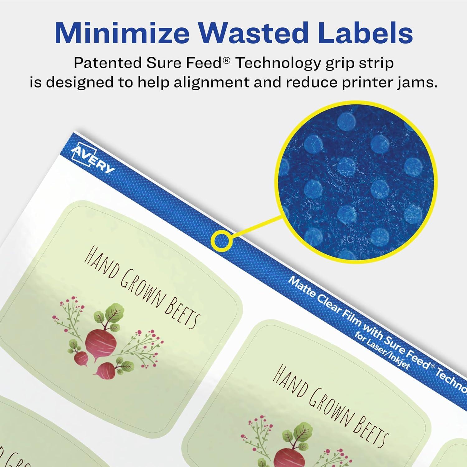 Create frosted clear product labels, branding labels, soap labels, ingredient labels, candle labels, jar labels, perfume labels, thank you labels, and more with Avery 2″ x 2-3/16″ Matte Clear Arched Square Labels. The soft, translucent material of Avery Clear Labels is perfect for creating clear labels that blend seamlessly into lighter-colored objects and surfaces. The slightly frosted appearance also helps provide contrast to make sure your print stays legible. Avery arched square labels are carefully constructed with patented features to provide the best results. Sure Feed technology reduces jams and smudges by creating a more reliable feed through your printer. The print-to-the-edge layout lets you print beautiful full-bleed designs that fill each blank sticker to the edge. The strong permanent label adhesive makes sure that your labels stick and stay to a variety of surfaces without peeling, curling or falling off. Easily customize labels with your own designs, art, symbols, and messaging by using the label templates and designs on the Avery website.