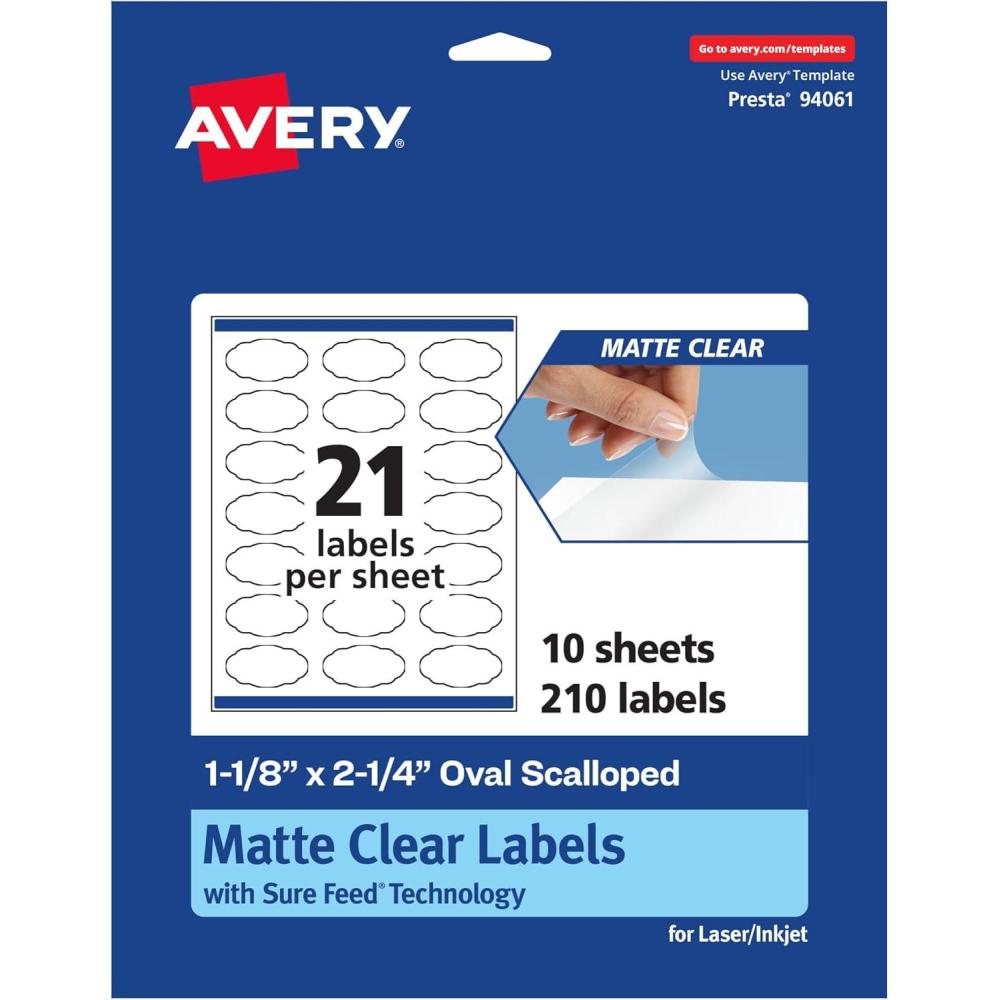 Avery Matte Clear Oval Scalloped Labels, Sure Feed Technology, 1-1/8″ x 2-1/4″, 210 Matte Clear Labels, Print-to-The-Edge, Laser/Inkjet Printable(210 labels)