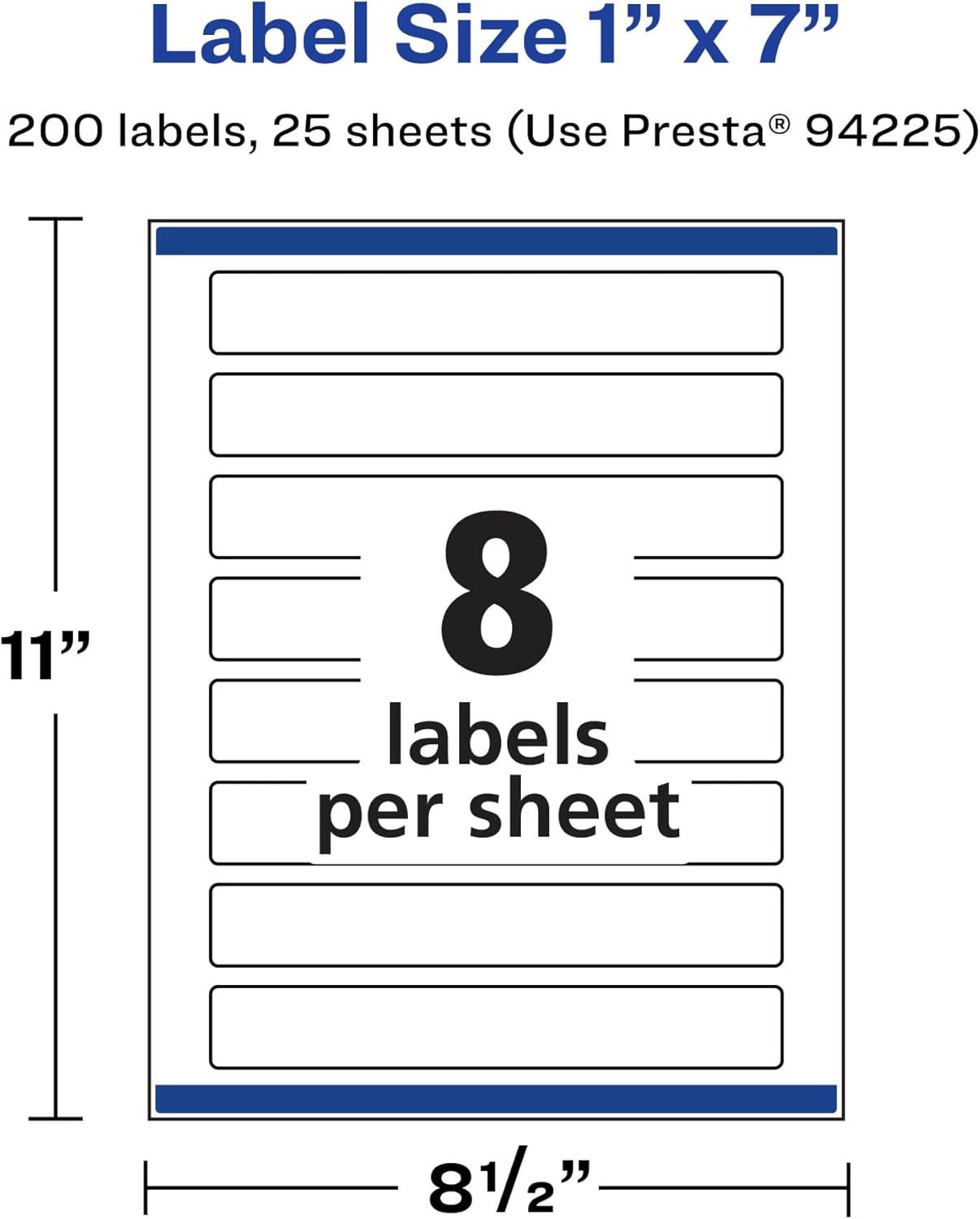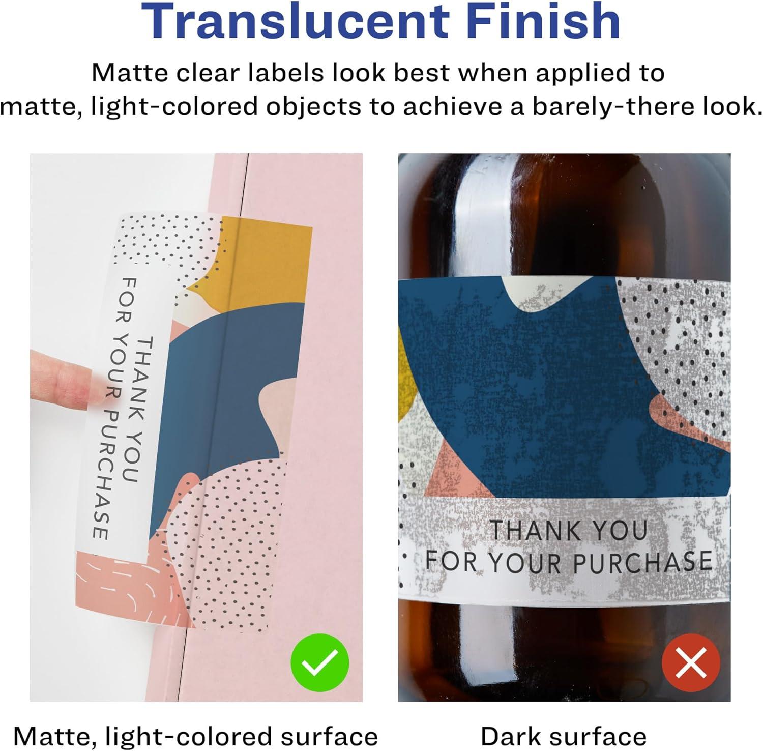Create frosted clear mailing and shipping labels, product labels, branding labels, labels for food containers, candle labels, jar labels, and more with Avery 1″ x 7″ Matte Clear Rectangle Labels. The soft, translucent material of Avery Clear Labels is perfect for creating clear labels that blend seamlessly into lighter-colored objects and surfaces. The slightly frosted appearance also helps provide contrast to make sure your print stays legible. Avery rectangle labels are carefully constructed with patented features to provide the best results. Sure Feed technology reduces jams and smudges by creating a more reliable feed through your printer. The print-to-the-edge layout lets you print beautiful full-bleed designs that fill each blank sticker to the edge. The strong permanent label adhesive makes sure that your labels stick and stay to a variety of surfaces without peeling, curling or falling off. Easily customize labels with your own designs, art, symbols, and messaging by using the label templates and designs on the Avery website.