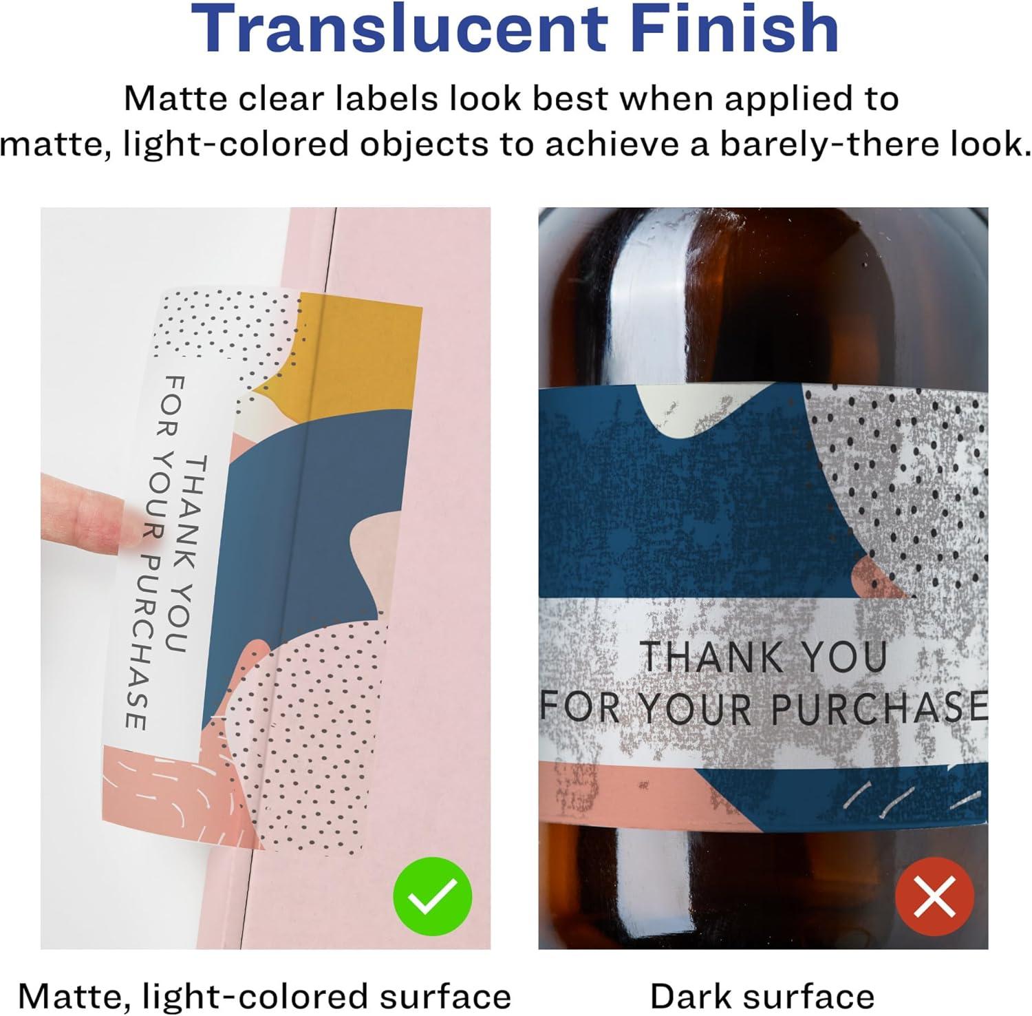 Create frosted clear product labels, mailing and shipping labels, labels for food containers, soap labels, candle labels, jar labels, cosmetic labels, and more with Avery 3″ x 5″ Matte Clear Rectangle Labels. The soft, translucent material of Avery Clear Labels is perfect for creating clear labels that blend seamlessly into lighter-colored objects and surfaces. The slightly frosted appearance also helps provide contrast to make sure your print stays legible. Avery rectangle labels are carefully constructed with patented features to provide the best results. Sure Feed technology reduces jams and smudges by creating a more reliable feed through your printer. The print-to-the-edge layout lets you print beautiful full-bleed designs that fill each blank sticker to the edge. The patented Easy Peel label design makes these labels easy to peel and quick to apply. Just bend the label sheet, peel off your labels and fold the sheet back flat. The strong permanent label adhesive makes sure that your labels stick and stay to a variety of surfaces without peeling, curling or falling off. Easily customize labels with your own designs, art, symbols, and messaging by using the label templates and designs on the Avery website.