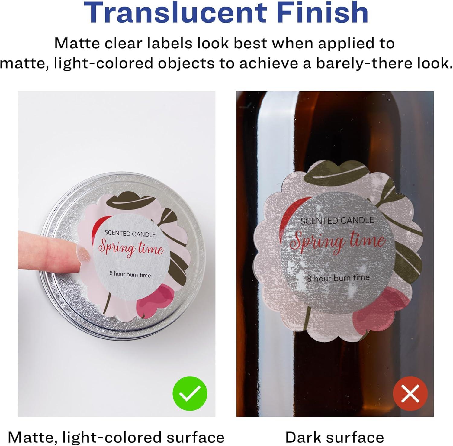 Create frosted clear product labels, soap labels, ingredient labels, candle labels, jar labels, perfume labels, wedding and party favor labels, thank you labels, and more with Avery 2-1/2″ Diameter Matte Clear Round Scalloped Labels. The soft, translucent material of Avery Clear Labels is perfect for creating clear labels that blend seamlessly into lighter-colored objects and surfaces. The slightly frosted appearance also helps provide contrast to make sure your print stays legible. Avery round scalloped labels are carefully constructed with patented features to provide the best results. Sure Feed technology reduces jams and smudges by creating a more reliable feed through your printer. The print-to-the-edge layout lets you print beautiful full-bleed designs that fill each blank sticker to the edge. The strong permanent label adhesive makes sure that your labels stick and stay to a variety of surfaces without peeling, curling or falling off. Easily customize labels with your own designs, art, symbols, and messaging by using the label templates and designs on the Avery website.