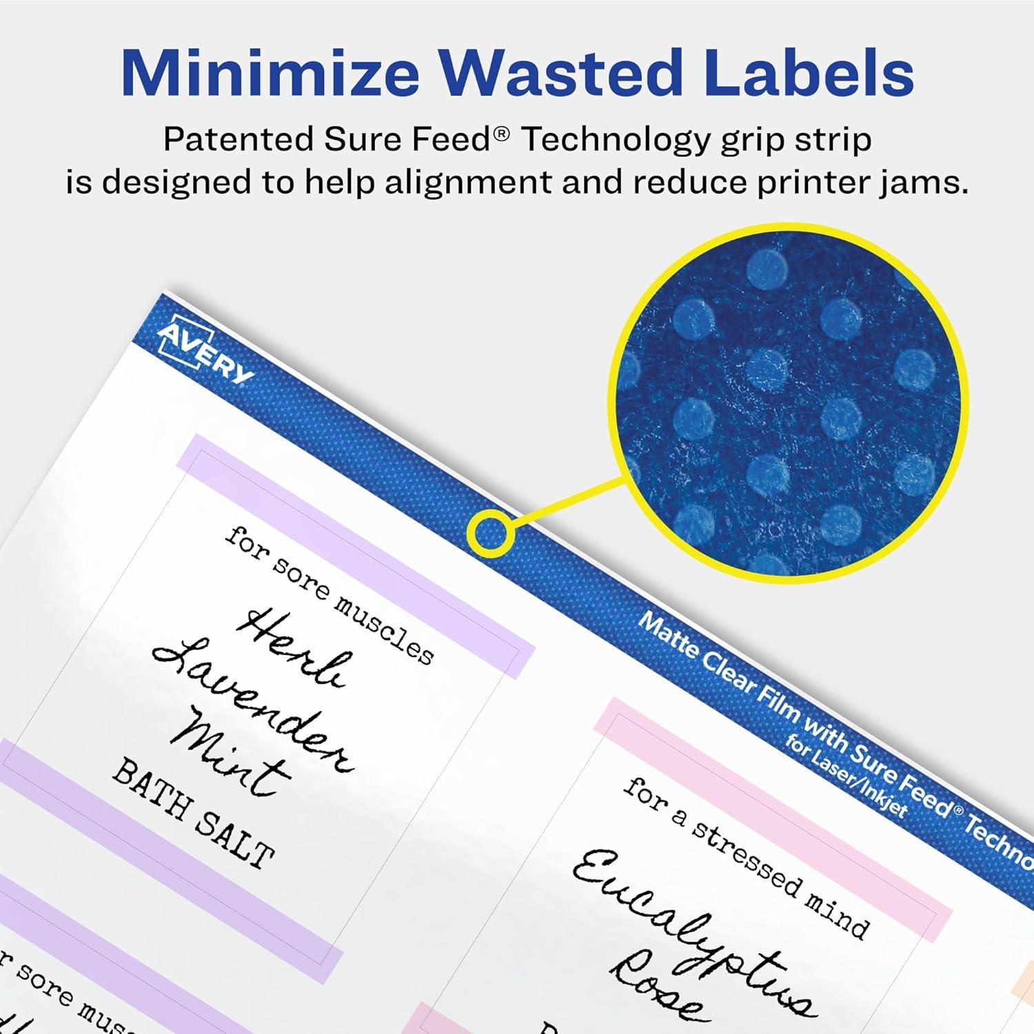 Avery Matte Clear Square Labels, Sure Feed Technology, 2" x 2", 120 Matte Clear Labels, Print-to-The-Edge, Laser/Inkjet Printable(600 labels)