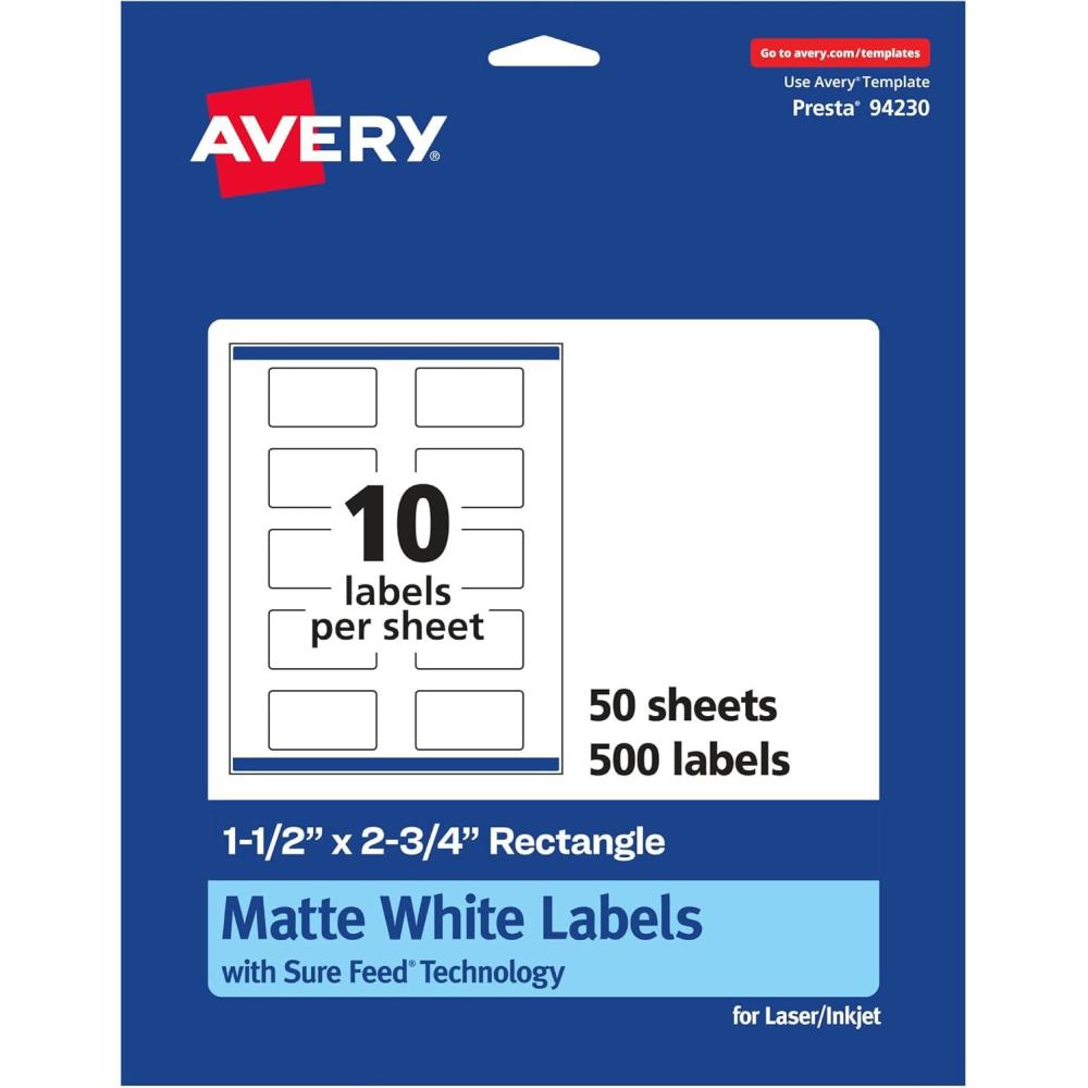 Avery Matte White Rectangle Labels, Sure Feed Technology, 1.5" x 2.75", 250 Matte White Printable Labels(500 Labels)