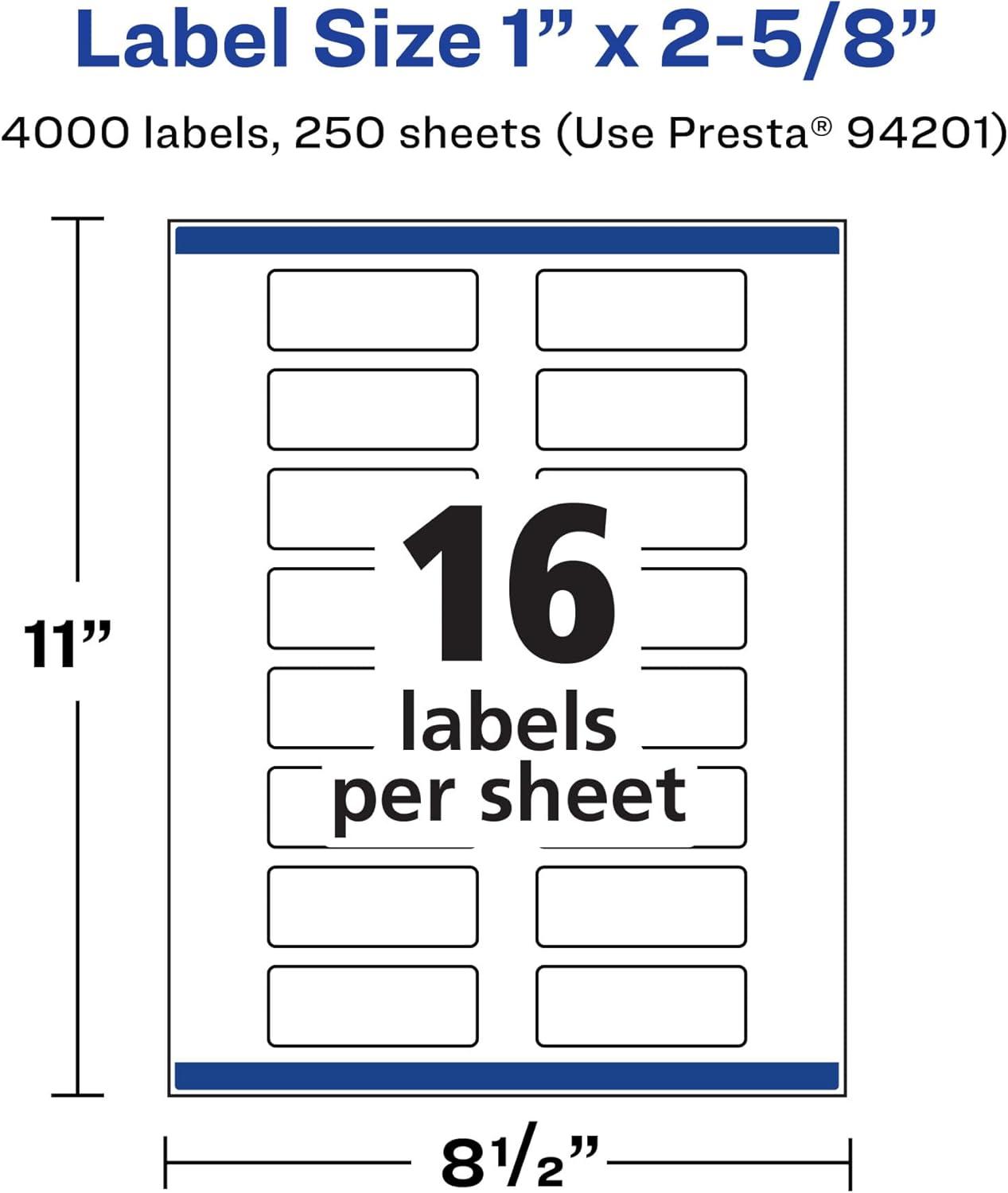 Matte white Avery labels are the perfect choice for any project. The smooth, matte white finish is a great fit whether you're designing product labels, shipping packages for work, making party favors or adding a creative touch to personal crafts or school projects. Each sheet of labels features Sure Feed technology which helps deliver a more reliable feed through your printer to prevent print misalignments and paper jams. The print-to-the-edge feature makes it easy to print beautiful designs that can reach the edges of the label without a border or outline. Quickly apply these labels with our patented Easy Peel label sheets with Pop-up Edge. Simply fold the sheet back to display the label edges for convenient and fast peeling. A strong permanent adhesive is used to ensure that these labels stick and stay to paper, cardboard, plastic, glass, metal and more without curling or falling off. The versatile label shape can adapt to almost any use, just create your design with our free software and print. Avery Design & Print makes it easy to create customized labels from your own home or business so that you can print professional designs with your laser or inkjet printer. Our free browser-based software includes predesigned templates as well as tools for editing text and images so that you can create address labels, product labels, food & beverage labels and more. Try it out today by searching for Avery template Presta 94201 on the Avery site.