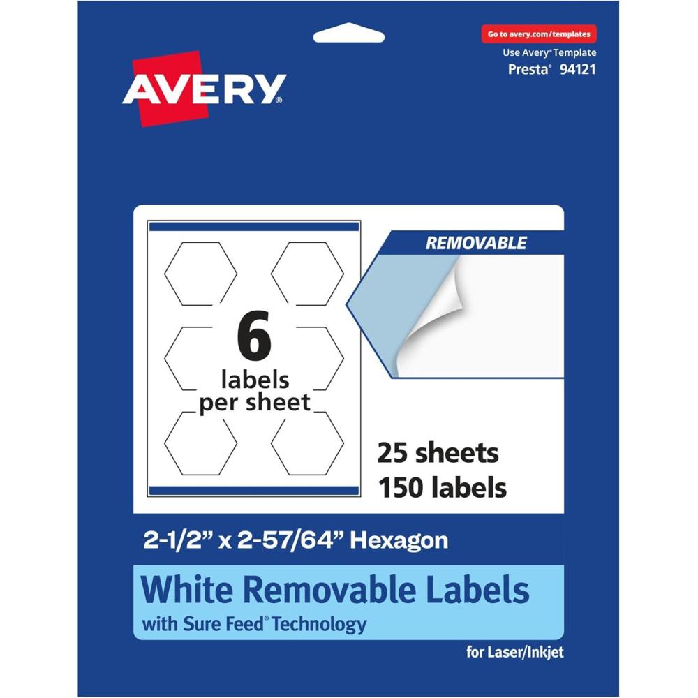 imageAvery Matte White Removable Hexagon Labels Sure Feed Technology PrinttoTheEdge 212quot x 25764quot 90 Removable Labels LaserInkjet Printable150 labels