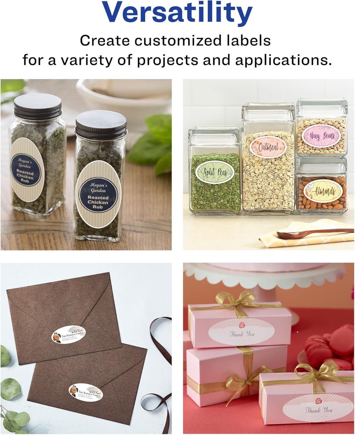 Add an elegant touch to home organization labels, price labels, mason jar labels, canning labels, ingredient labels, soap jar labels and more with Avery 2″ x 3-1/3″ Matte White Removable Oval Labels. Made with matte white paper and removable adhesive, the removable Avery labels stick and stay but remove cleanly. Apply these removable white labels to smooth surfaces such as paper, plastic, cardboard, glass, or metal and peel them away without leaving behind messy residue. Avery oval labels are carefully constructed with patented features to provide the best results. Sure Feed technology reduces jams or smudges by creating a more reliable feed through your printer. The print-to-the-edge layout lets you print beautiful full-bleed designs that fill each blank sticker to the edge. The Pop-Up Edge lets you fold the sheet back to pop up the edges of each label for faster peeling. The dual-compatible printable labels are compatible with both laser printers and inkjet printers. Easily customize labels with your own designs, art, symbols, and messaging in Avery Design & Print.