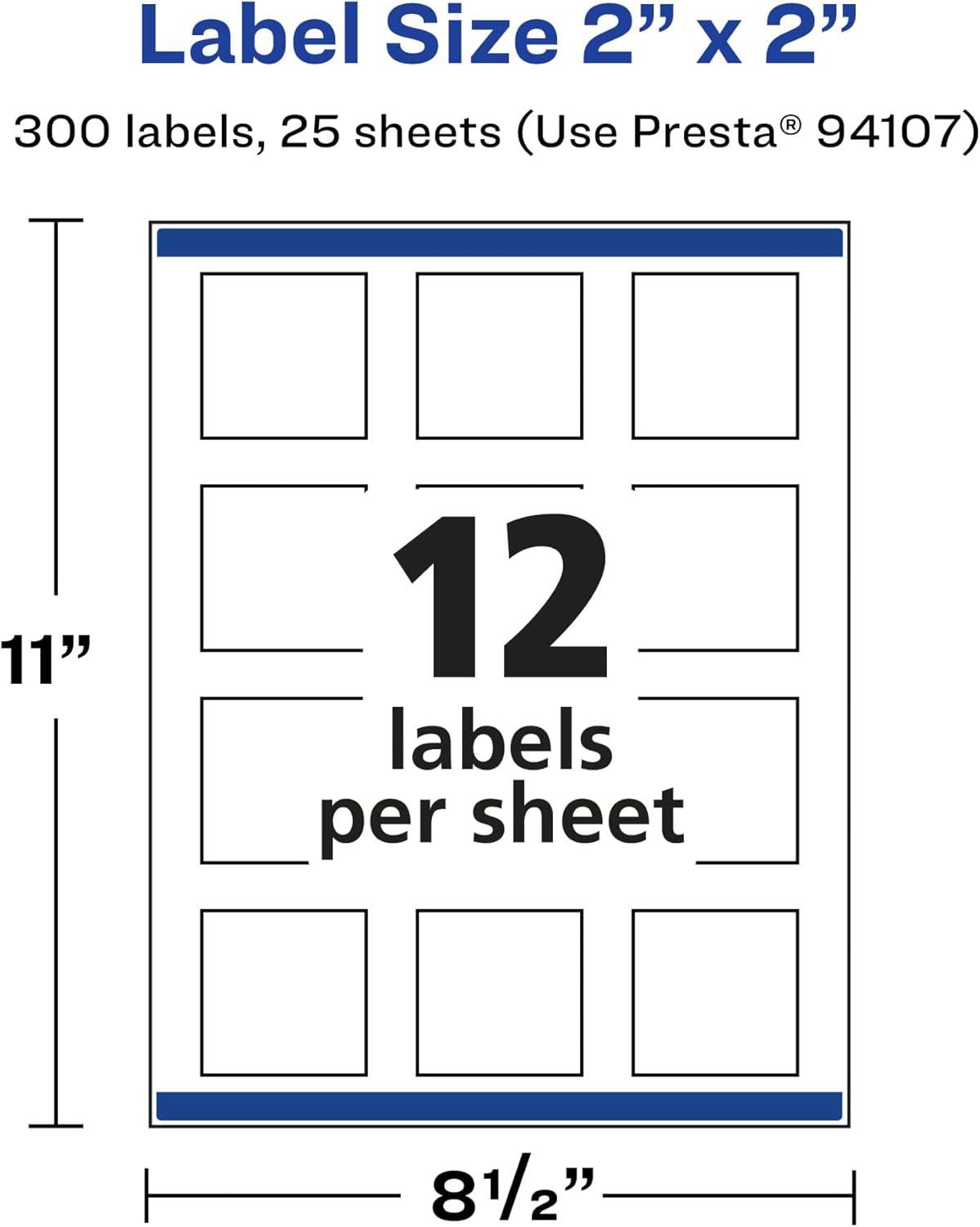 Avery Matte White Removable Square Labels, Sure Feed Technology, Print-to-The-Edge, 2" x 2", 180 Removable Labels, Laser/Inkjet Printable(300 labels)