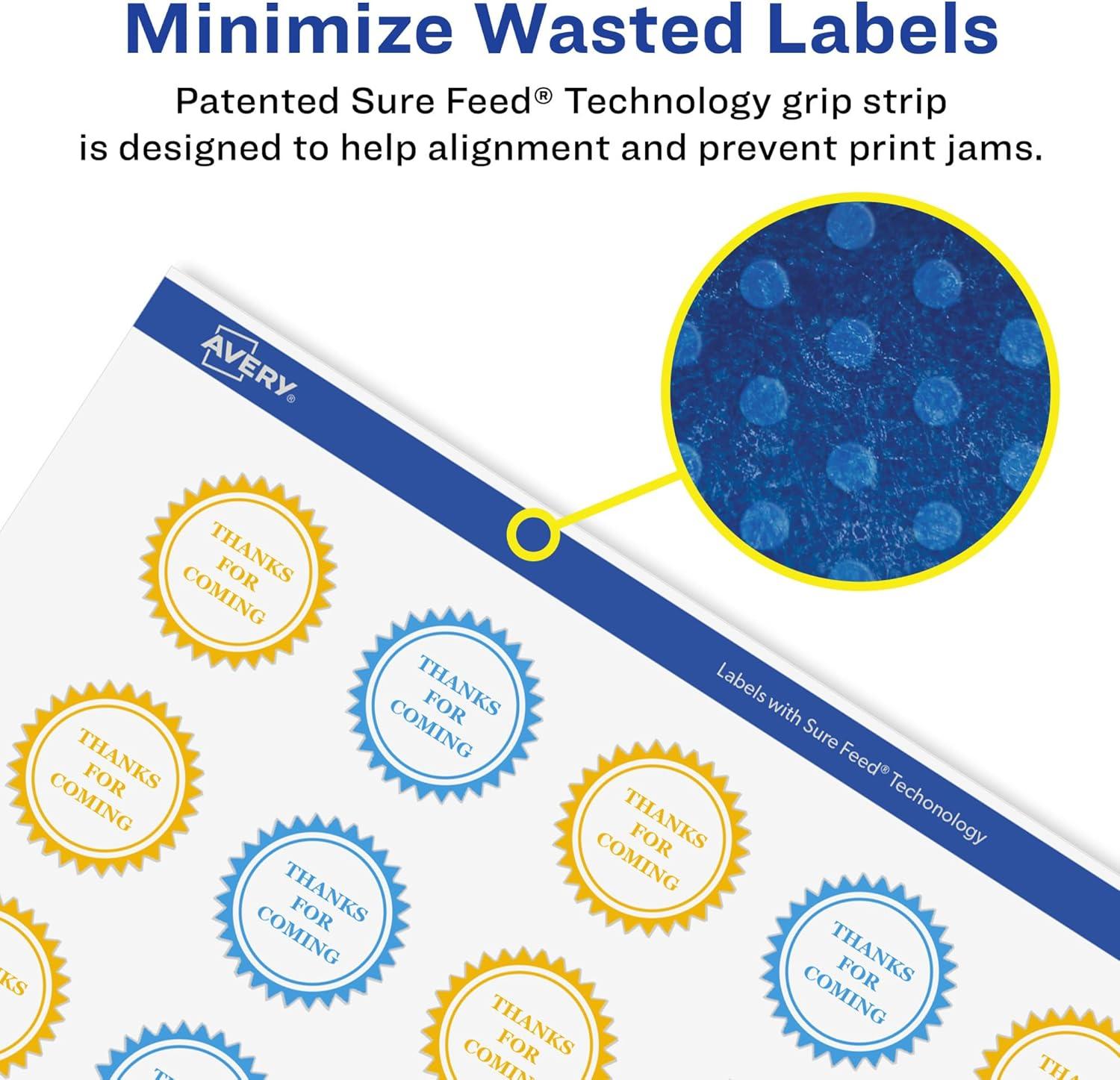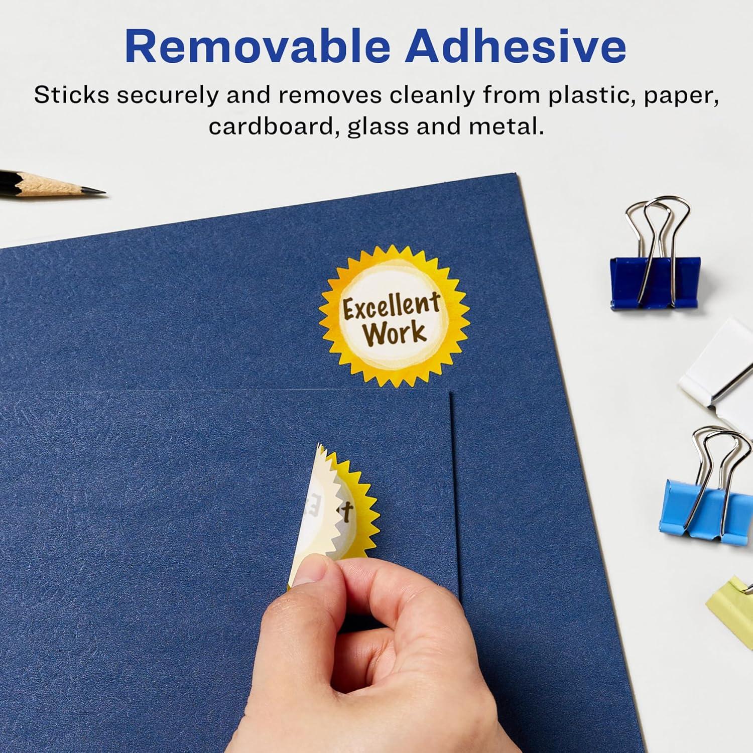 Add an elegant touch to home organization labels, price labels, reward stickers for kids, certificate seals, decorative labels, mailing seals, planner stickers and more with Avery 1.75″ Matte White Removable Starburst Labels. Made with matte white paper and removable adhesive, the removable Avery labels stick and stay but remove cleanly. Apply these removable white labels to smooth surfaces such as paper, plastic, cardboard, glass, or metal and peel them away without leaving behind messy residue. Avery starburst labels are carefully constructed with patented features to provide the best results. Sure Feed technology reduces jams or smudges by creating a more reliable feed through your printer. The print-to-the-edge layout lets you print beautiful full-bleed designs that fill each blank sticker to the edge. The dual-compatible printable labels are compatible with both laser printers and inkjet printers. Easily customize labels with your own designs, art, symbols, and messaging in Avery Design & Print. Whether you’re looking for labels to help organize your home, labels for a school project or product labels that will grab people’s attention, Avery Matte White Removable Labels are the perfect choice for any project.