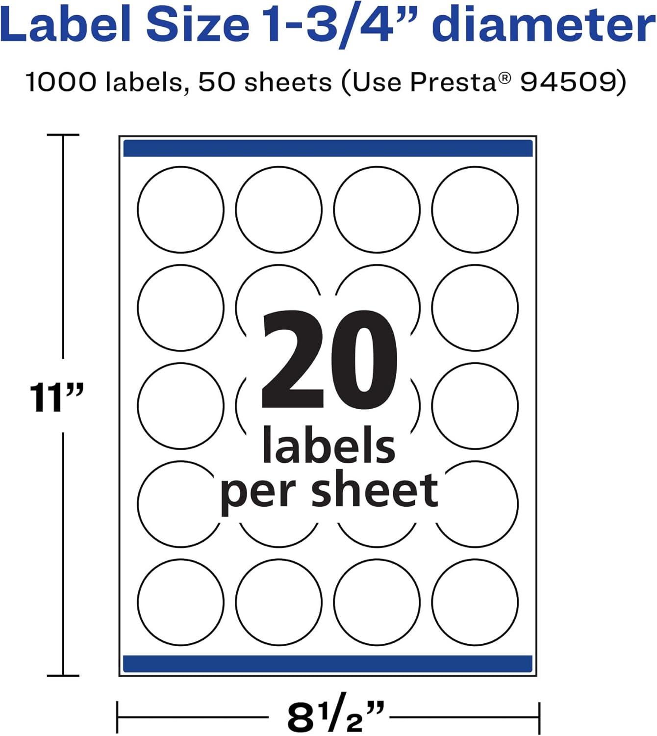 Avery Matte White Round Labels, Sure Feed Technology, 1.75″ Diameter, 500 Matte White Printable Labels(1 000 Labels)
